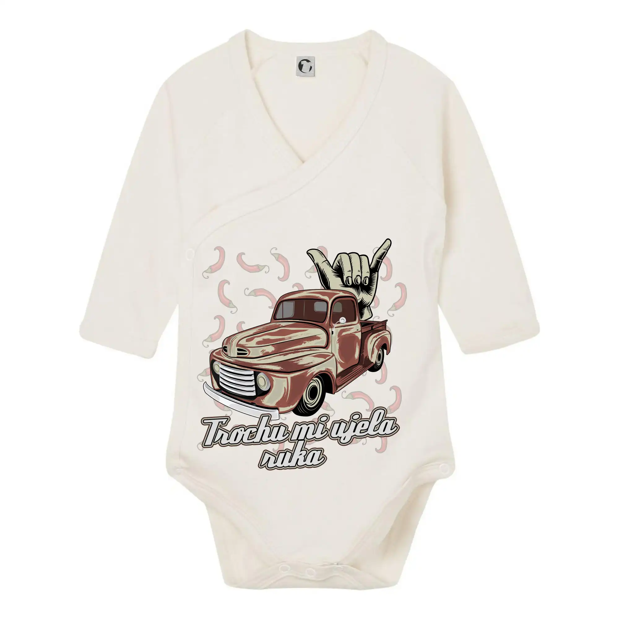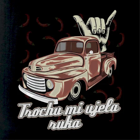 Vtipné tričko pre kuchára s nápisom "Trochu mi ušla ruka" s chilli papričkami. Pálivé papričky sa musia pridávať opatrne, niekedy sa to ale nepodarí a je ich v jedle toľko, že by to naštartovalo aj auto.