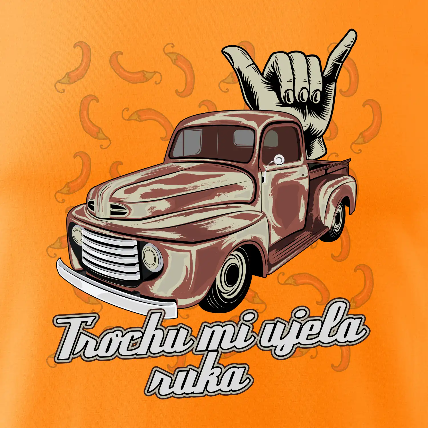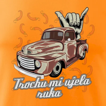 Vtipné tričko pre kuchára s nápisom "Trochu mi ušla ruka" s chilli papričkami. Pálivé papričky sa musia pridávať opatrne, niekedy sa to ale nepodarí a je ich v jedle toľko, že by to naštartovalo aj auto.