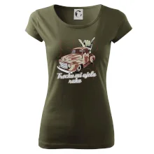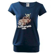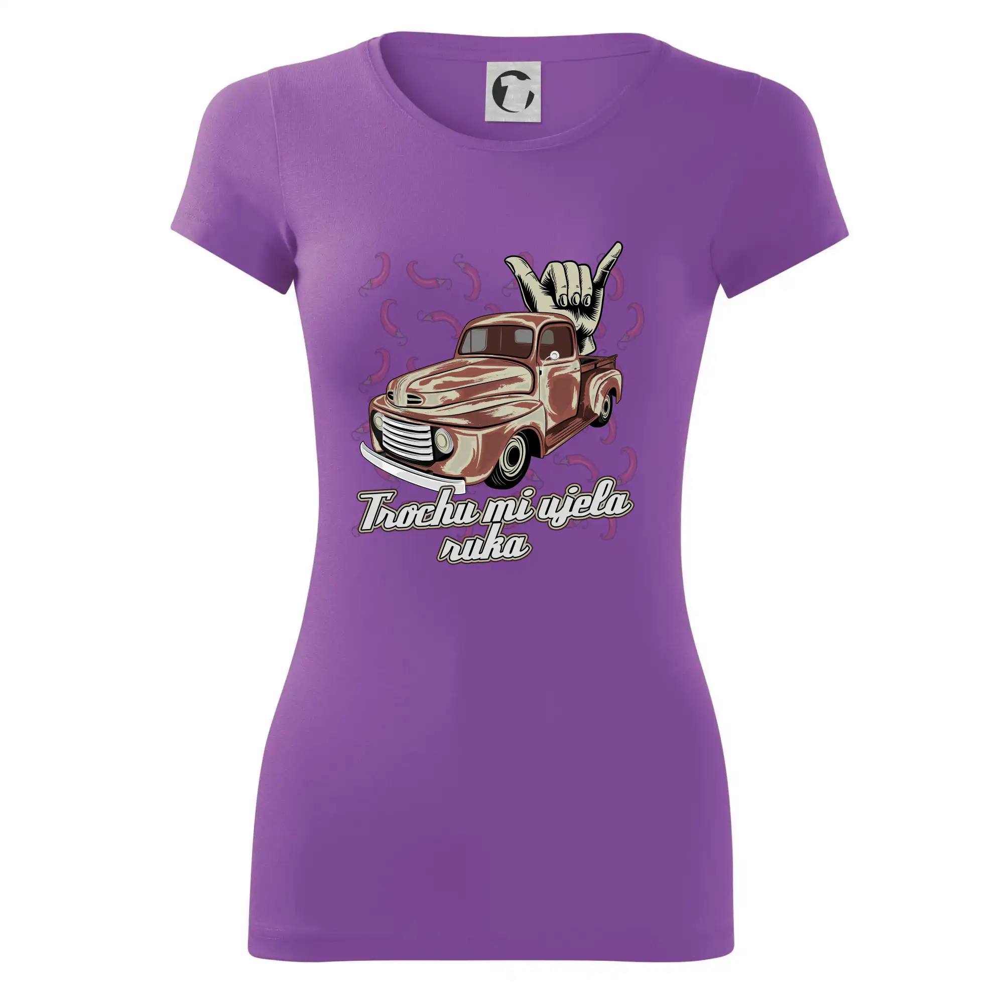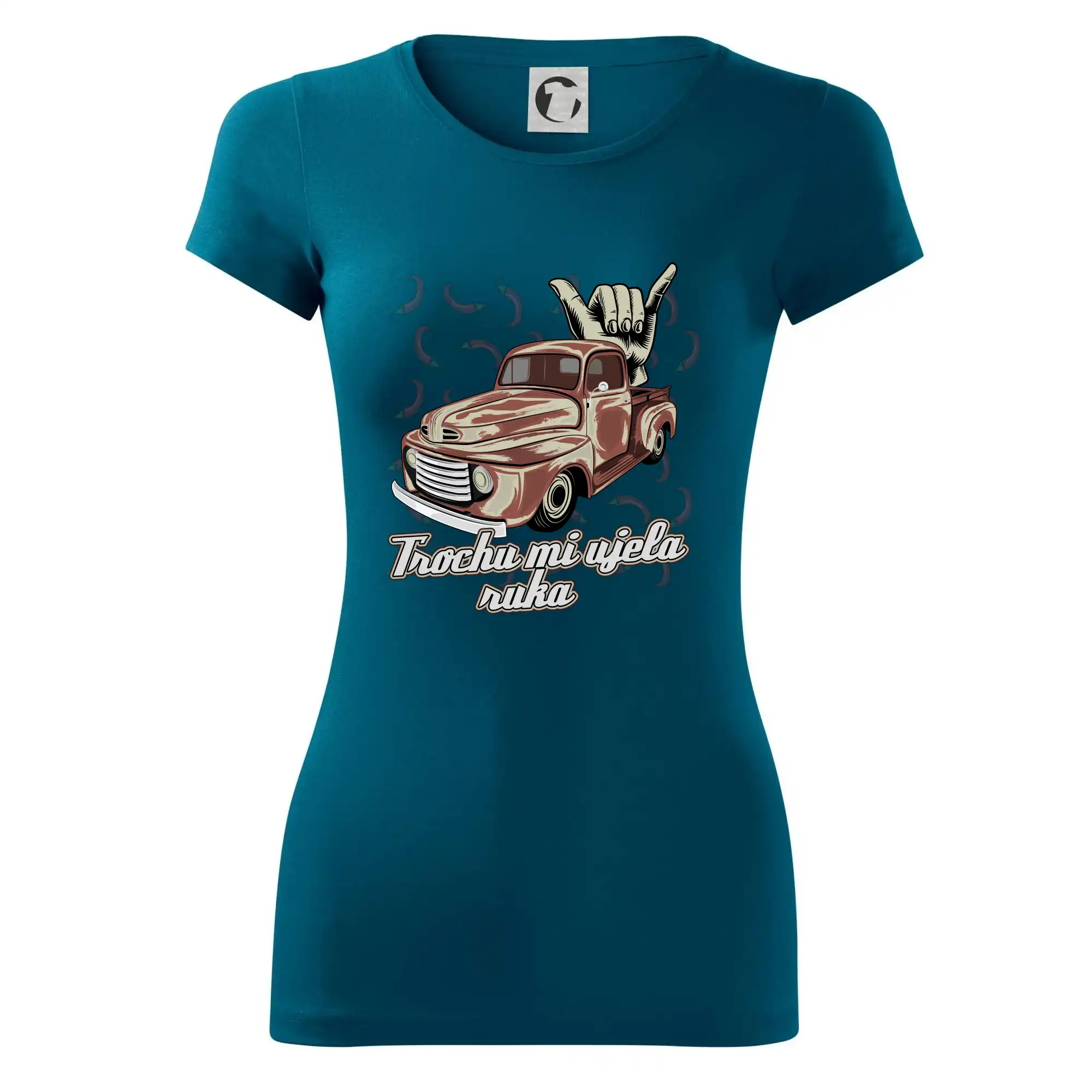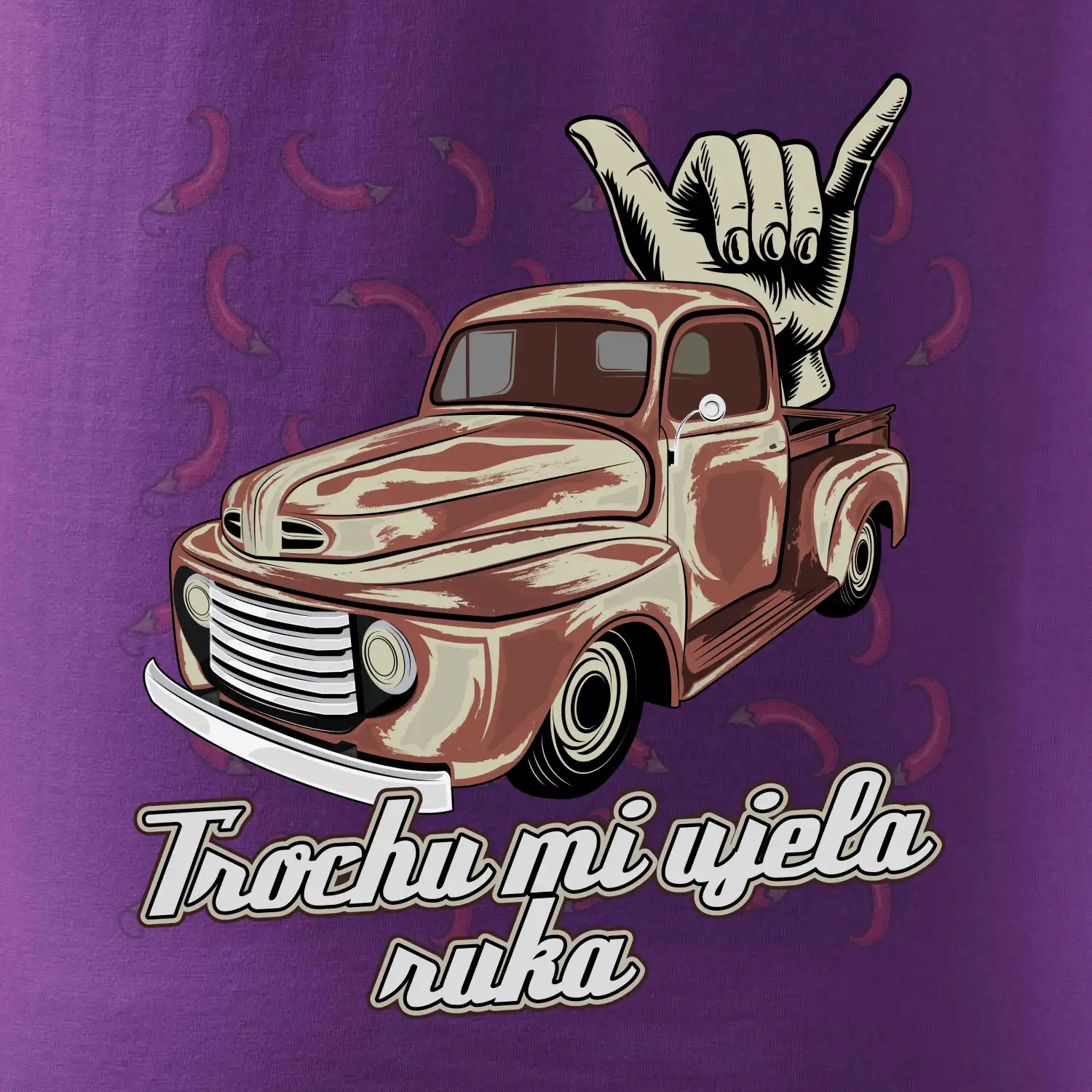 Vtipné tričko pre kuchára s nápisom "Trochu mi ušla ruka" s chilli papričkami. Pálivé papričky sa musia pridávať opatrne, niekedy sa to ale nepodarí a je ich v jedle toľko, že by to naštartovalo aj auto.