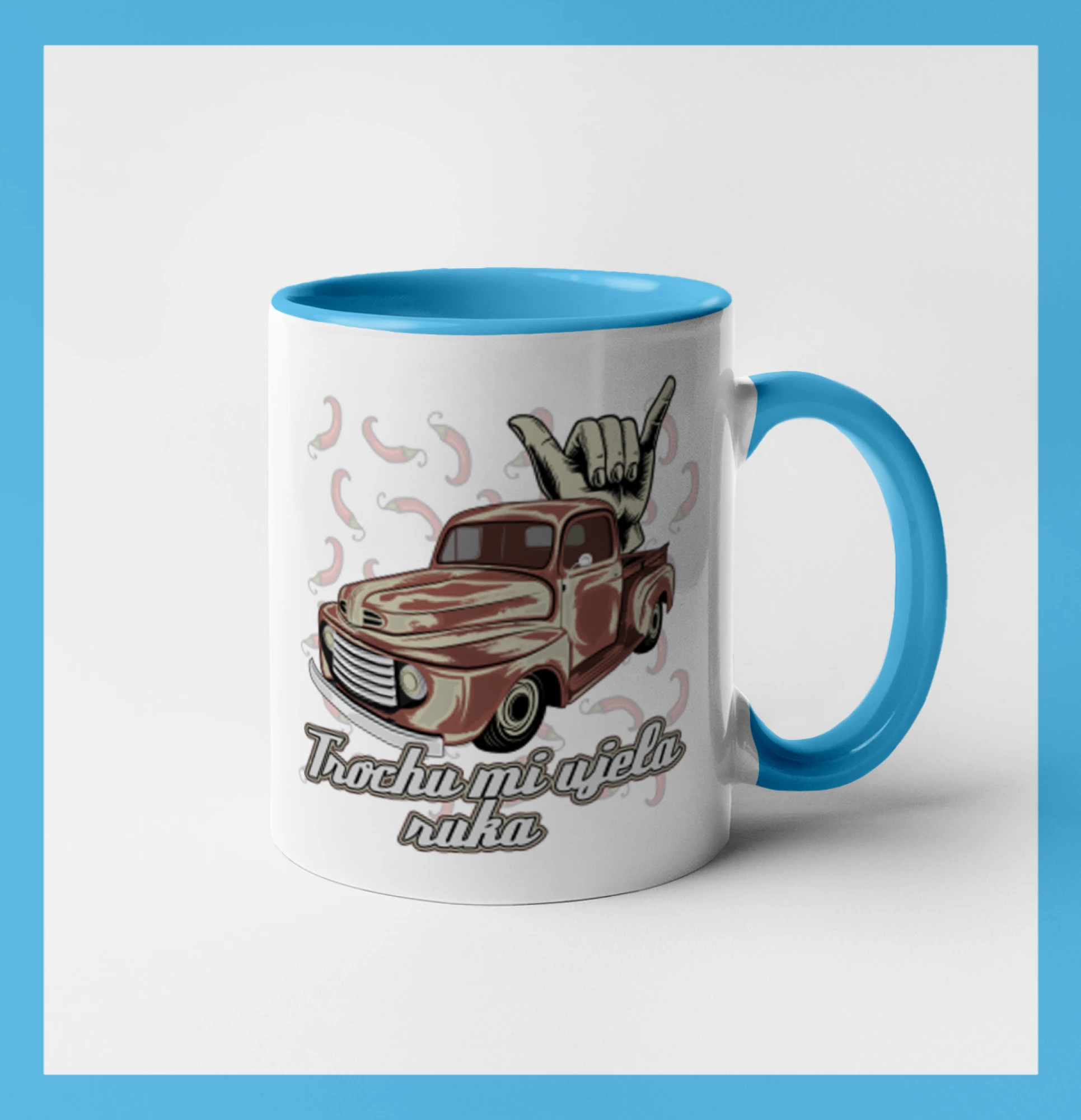 Vtipné tričko pre kuchára s nápisom "Trochu mi ušla ruka" s chilli papričkami. Pálivé papričky sa musia pridávať opatrne, niekedy sa to ale nepodarí a je ich v jedle toľko, že by to naštartovalo aj auto.