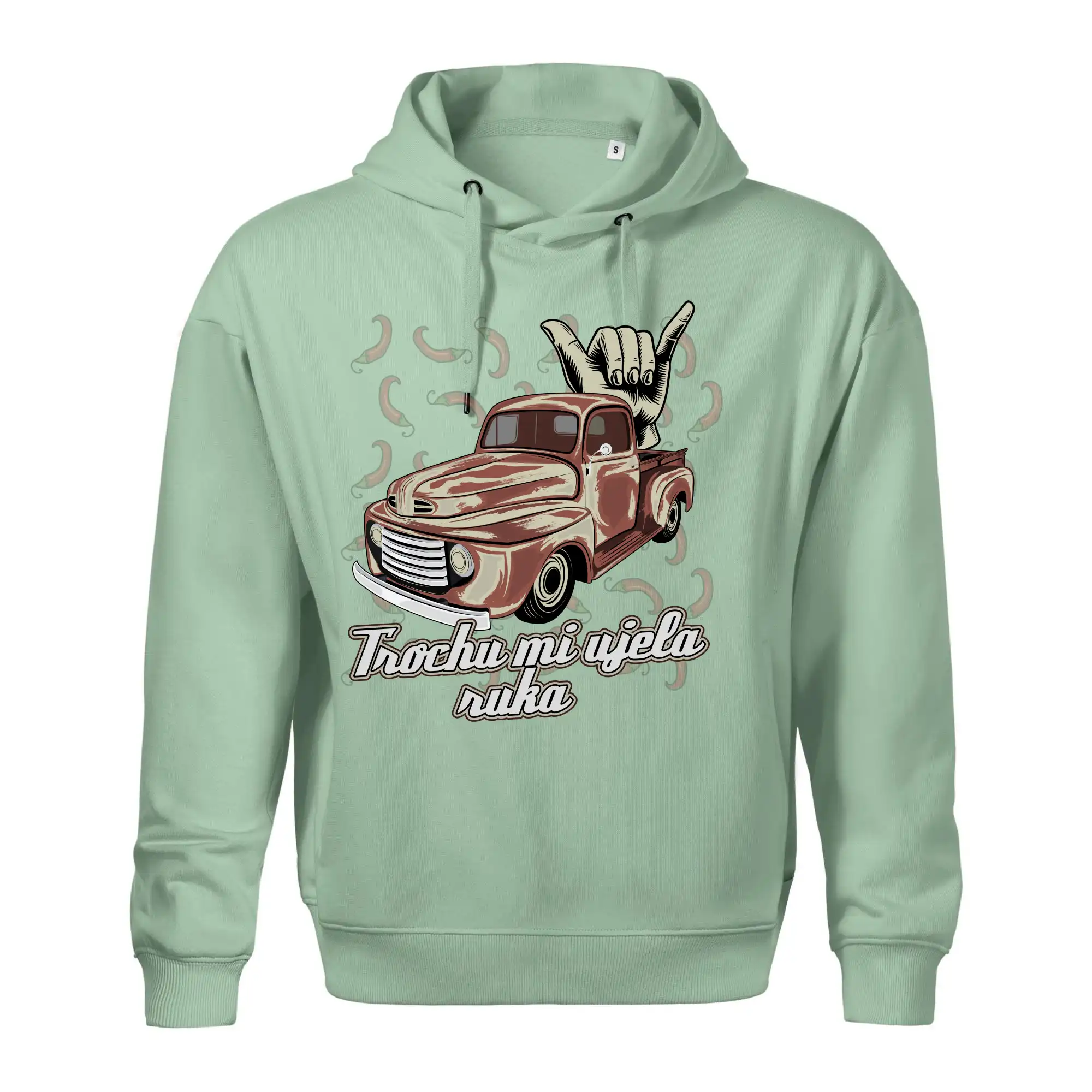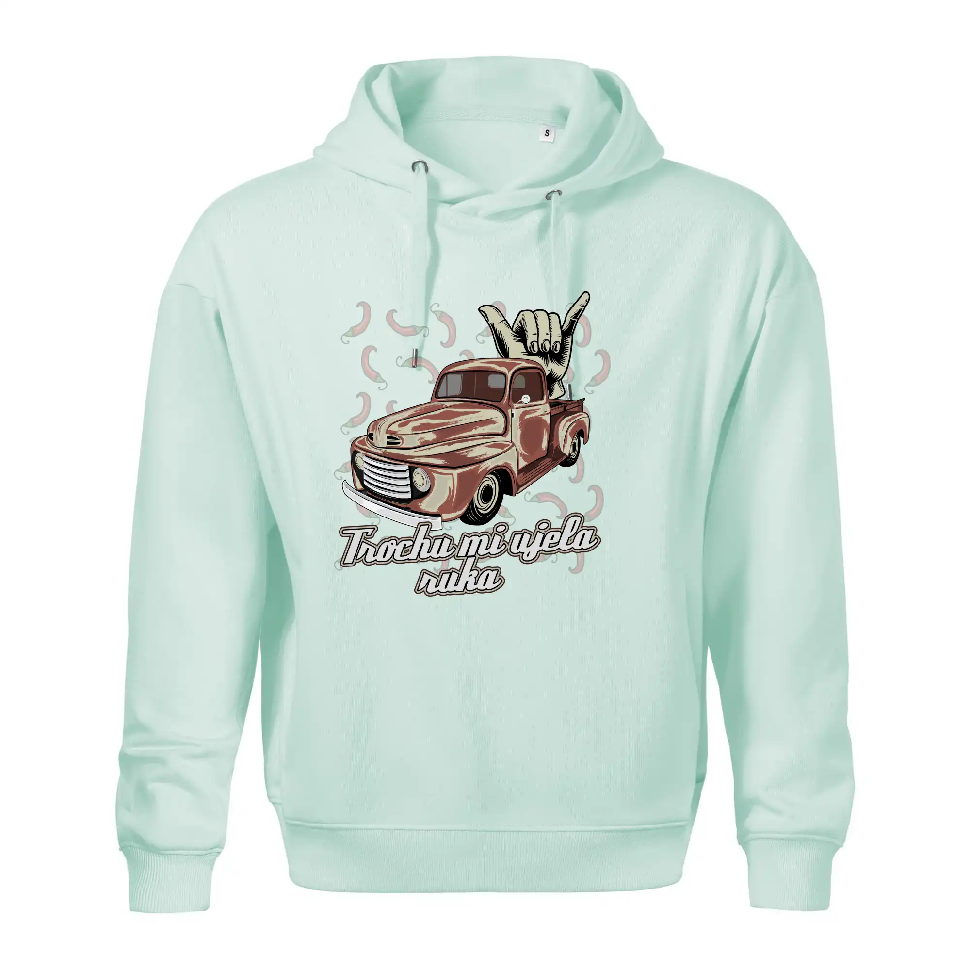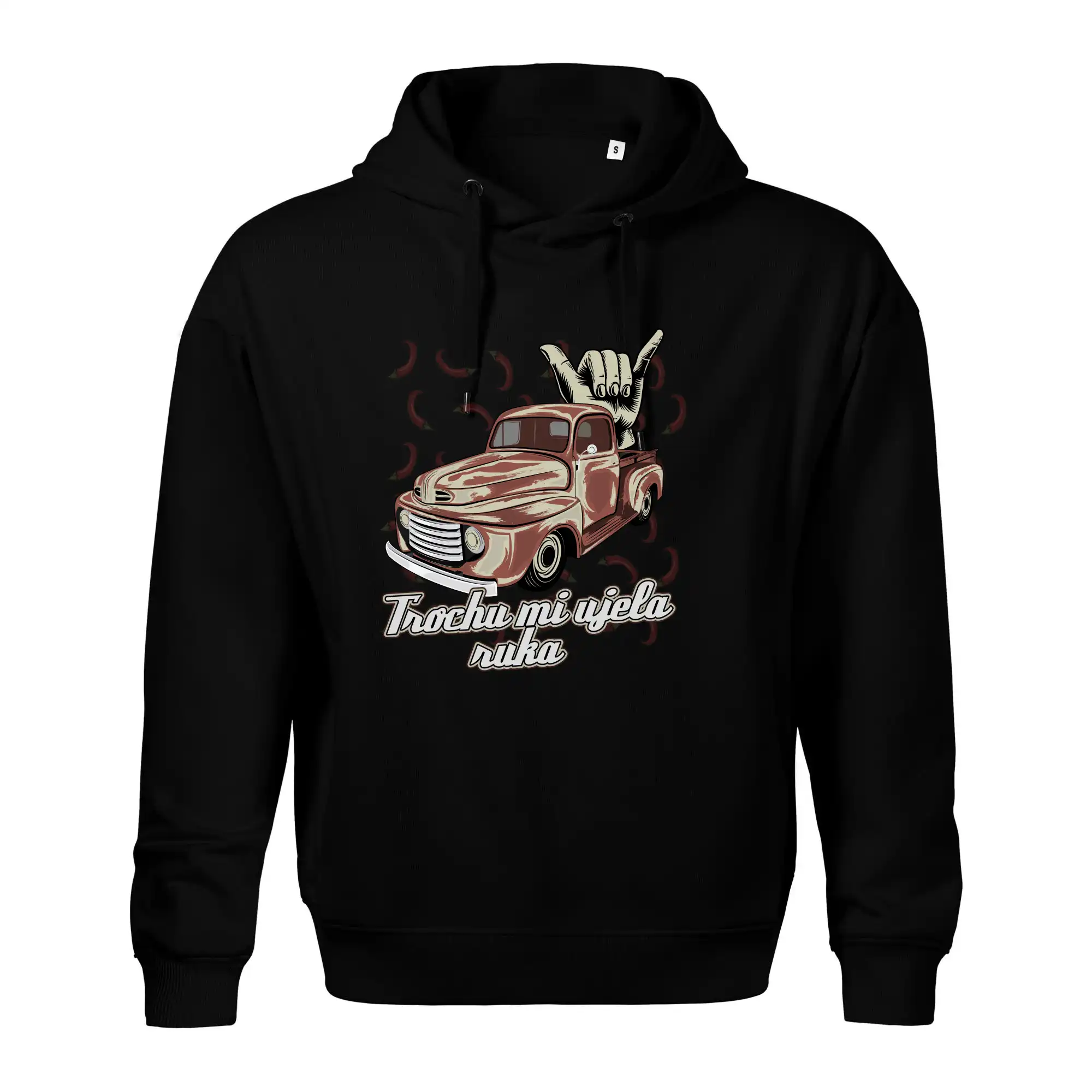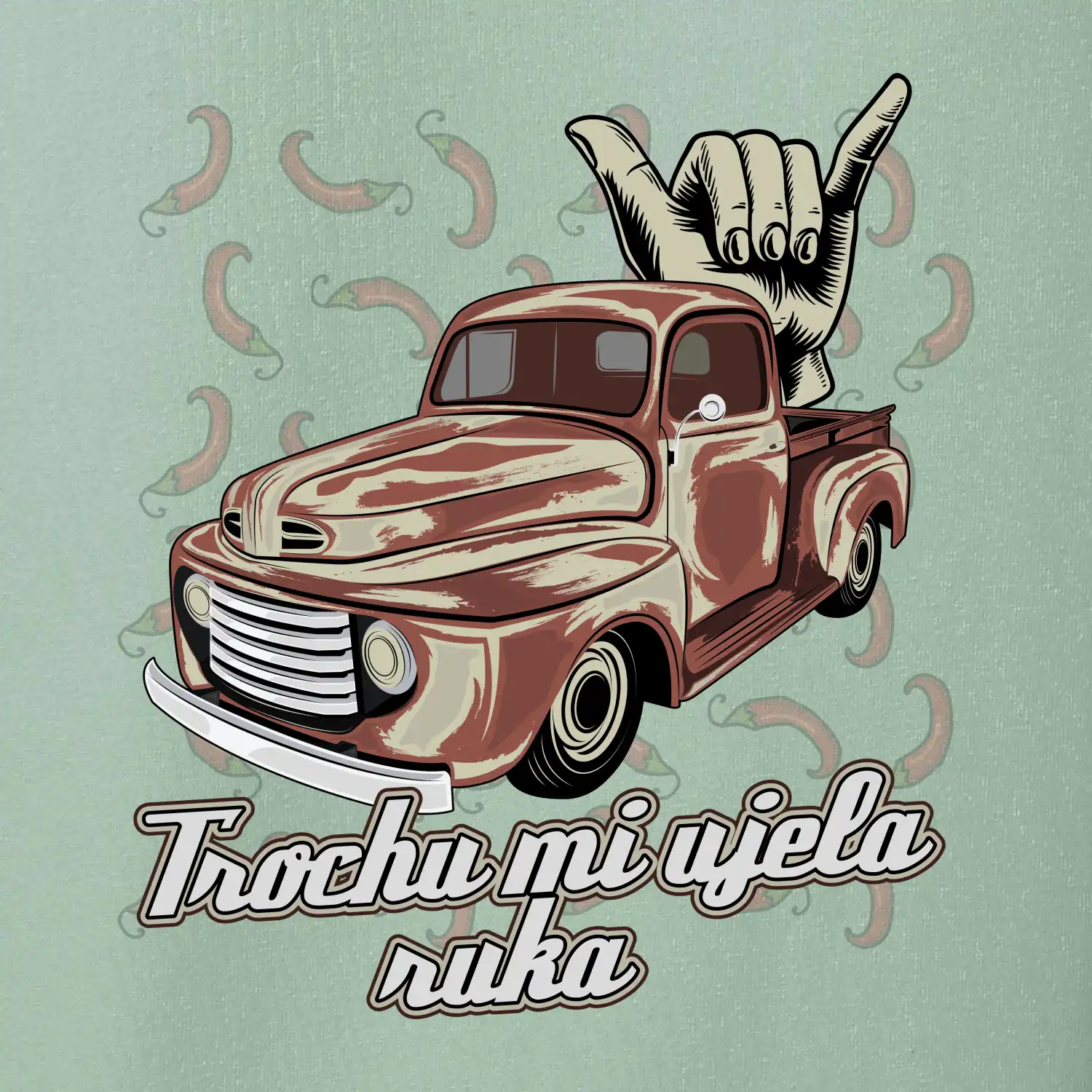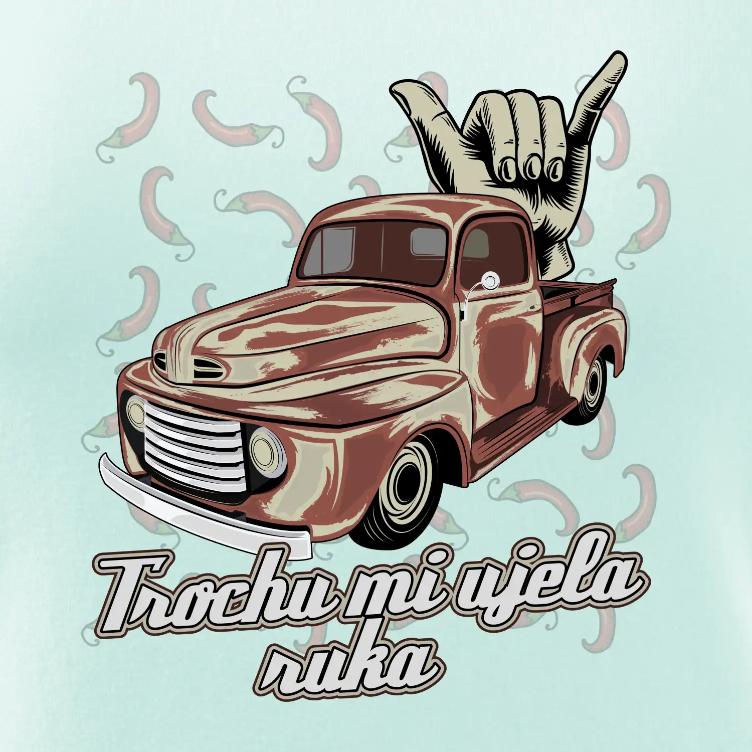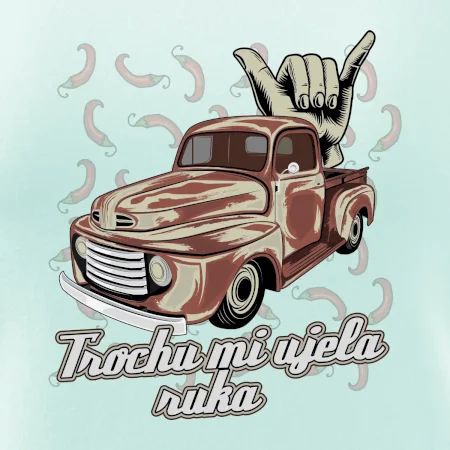 Vtipné tričko pre kuchára s nápisom "Trochu mi ušla ruka" s chilli papričkami. Pálivé papričky sa musia pridávať opatrne, niekedy sa to ale nepodarí a je ich v jedle toľko, že by to naštartovalo aj auto.