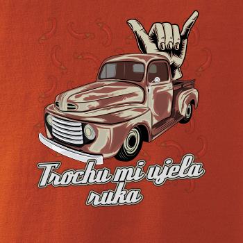 Vtipné tričko pre kuchára s nápisom "Trochu mi ušla ruka" s chilli papričkami. Pálivé papričky sa musia pridávať opatrne, niekedy sa to ale nepodarí a je ich v jedle toľko, že by to naštartovalo aj auto.