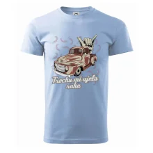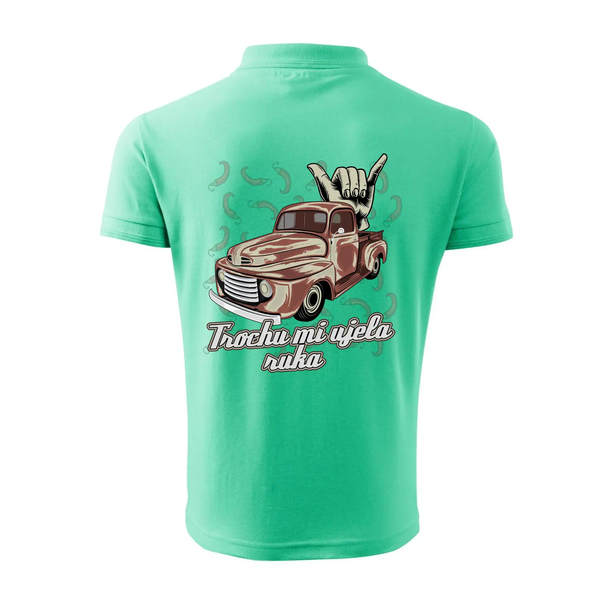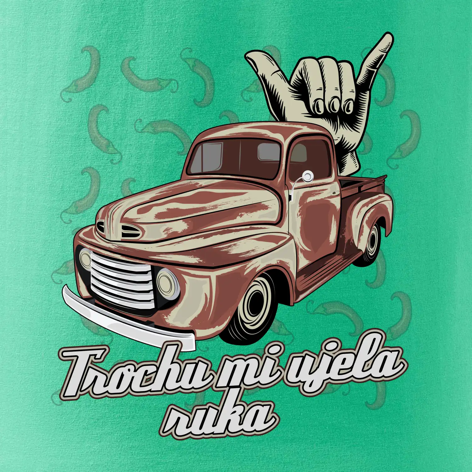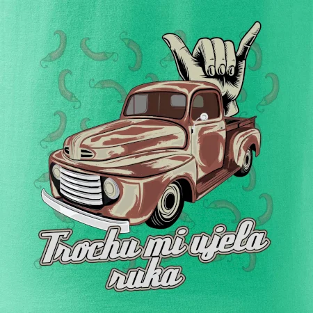 Vtipné tričko pre kuchára s nápisom "Trochu mi ušla ruka" s chilli papričkami. Pálivé papričky sa musia pridávať opatrne, niekedy sa to ale nepodarí a je ich v jedle toľko, že by to naštartovalo aj auto.