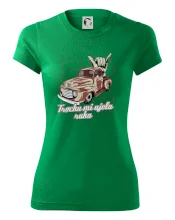 Vtipné tričko pre kuchára s nápisom "Trochu mi ušla ruka" s chilli papričkami. Pálivé papričky sa musia pridávať opatrne, niekedy sa to ale nepodarí a je ich v jedle toľko, že by to naštartovalo aj auto.