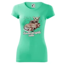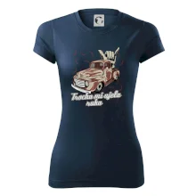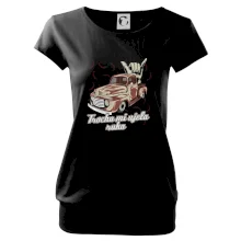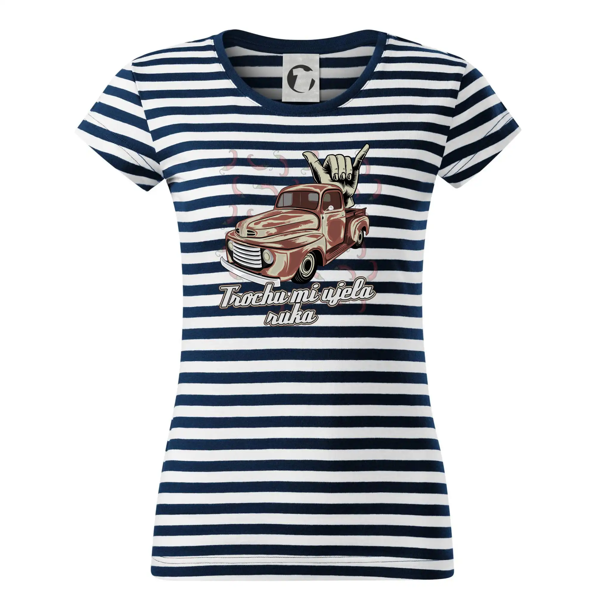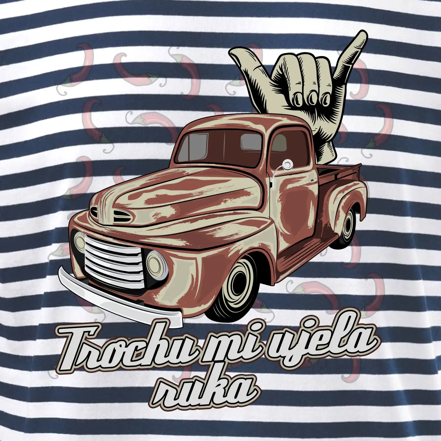 Vtipné tričko pre kuchára s nápisom "Trochu mi ušla ruka" s chilli papričkami. Pálivé papričky sa musia pridávať opatrne, niekedy sa to ale nepodarí a je ich v jedle toľko, že by to naštartovalo aj auto.
