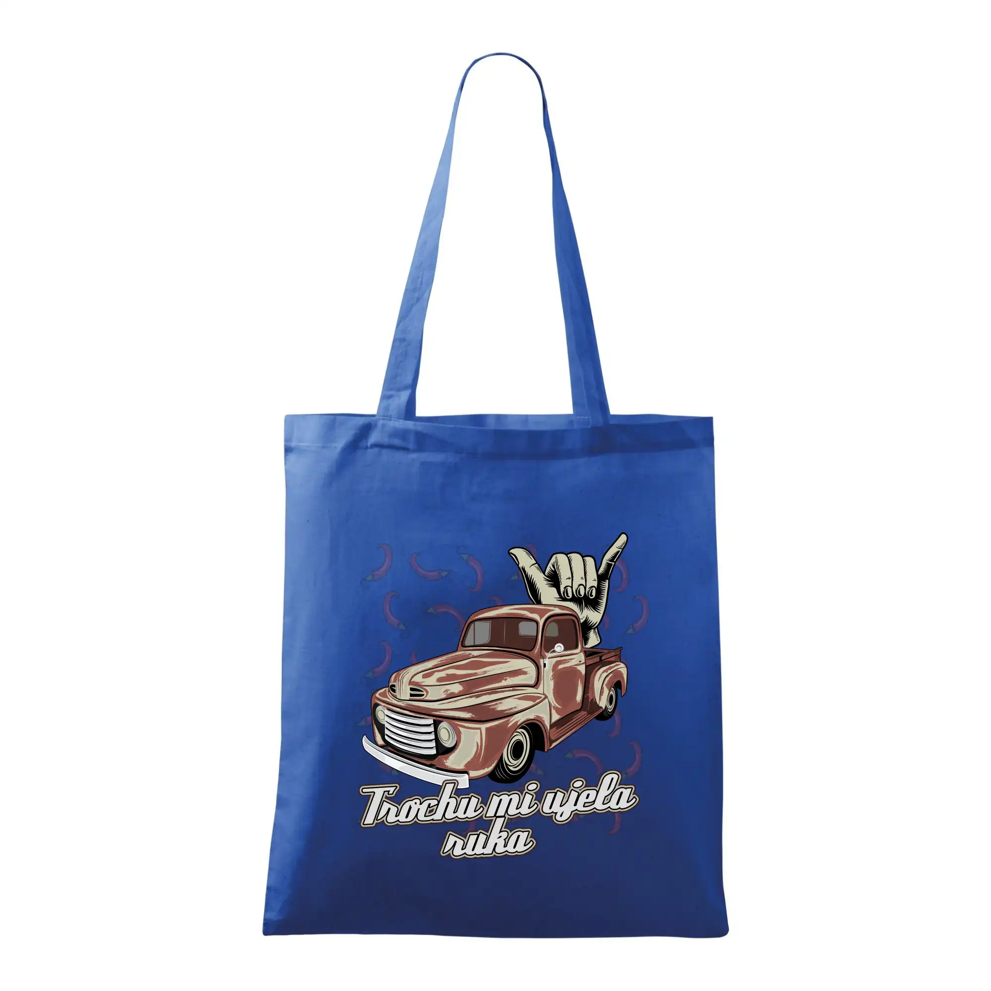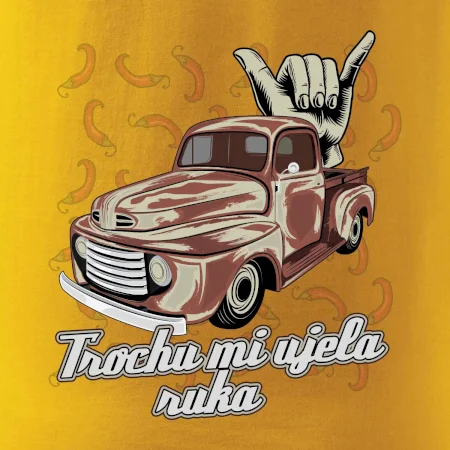 Vtipné tričko pre kuchára s nápisom "Trochu mi ušla ruka" s chilli papričkami. Pálivé papričky sa musia pridávať opatrne, niekedy sa to ale nepodarí a je ich v jedle toľko, že by to naštartovalo aj auto.