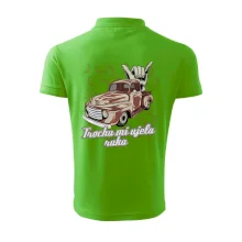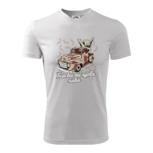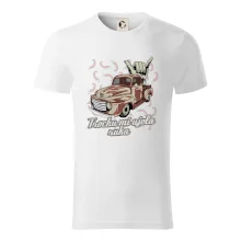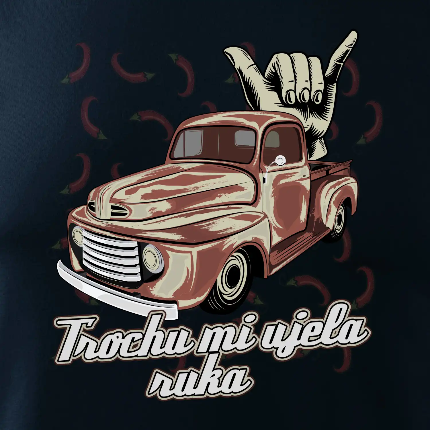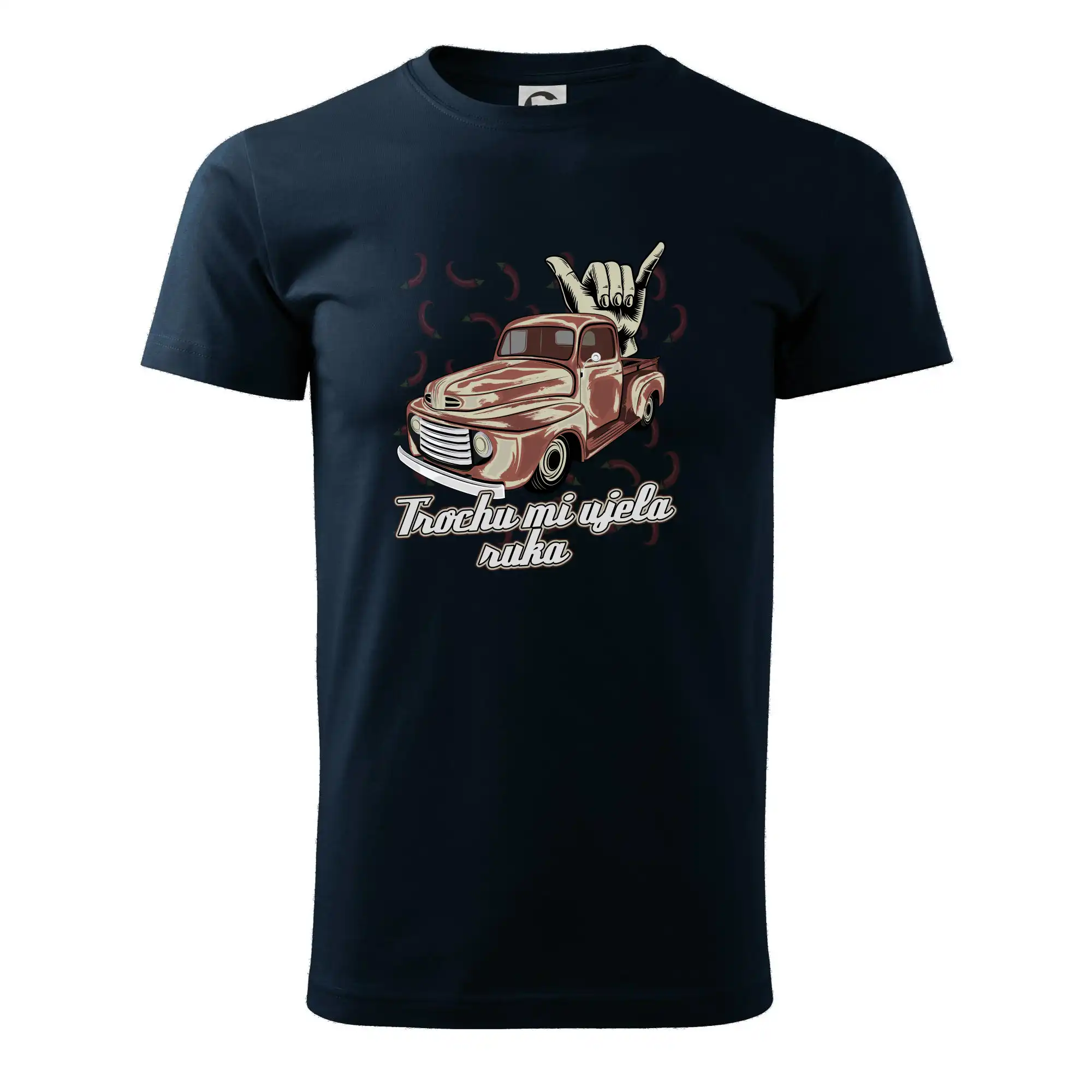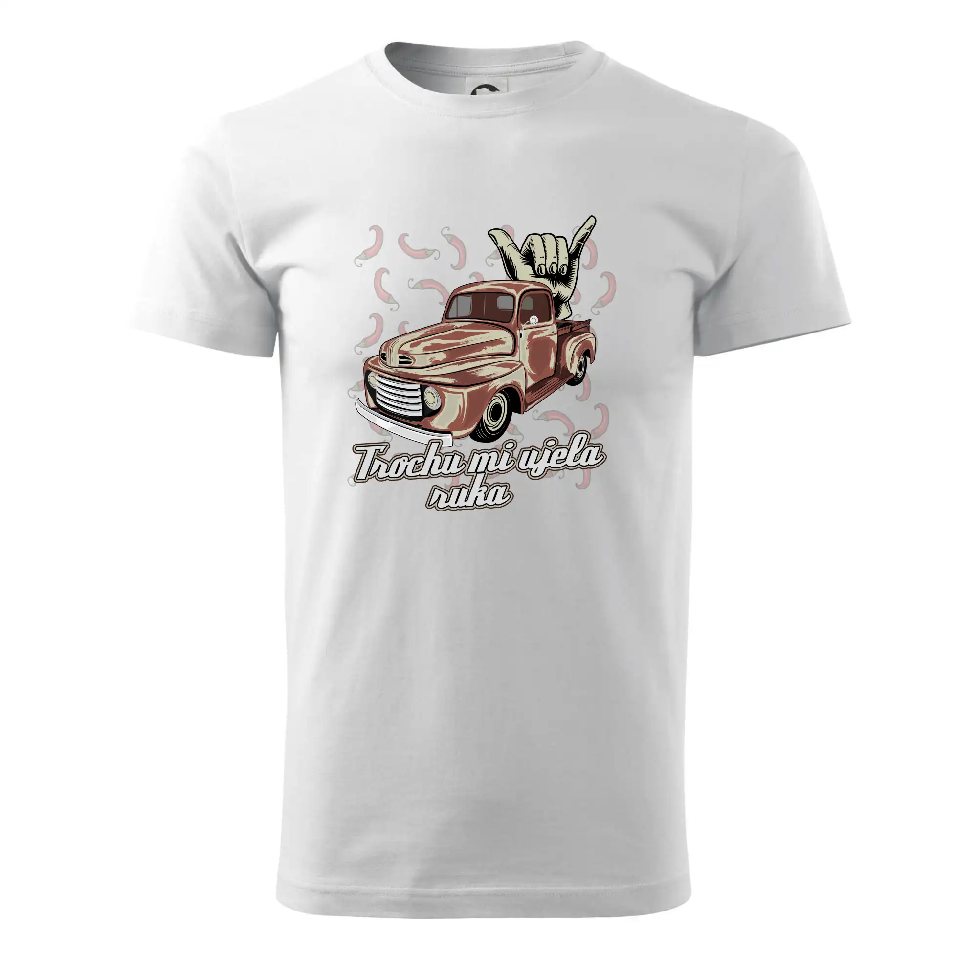Vtipné tričko pre kuchára s nápisom "Trochu mi ušla ruka" s chilli papričkami. Pálivé papričky sa musia pridávať opatrne, niekedy sa to ale nepodarí a je ich v jedle toľko, že by to naštartovalo aj auto.