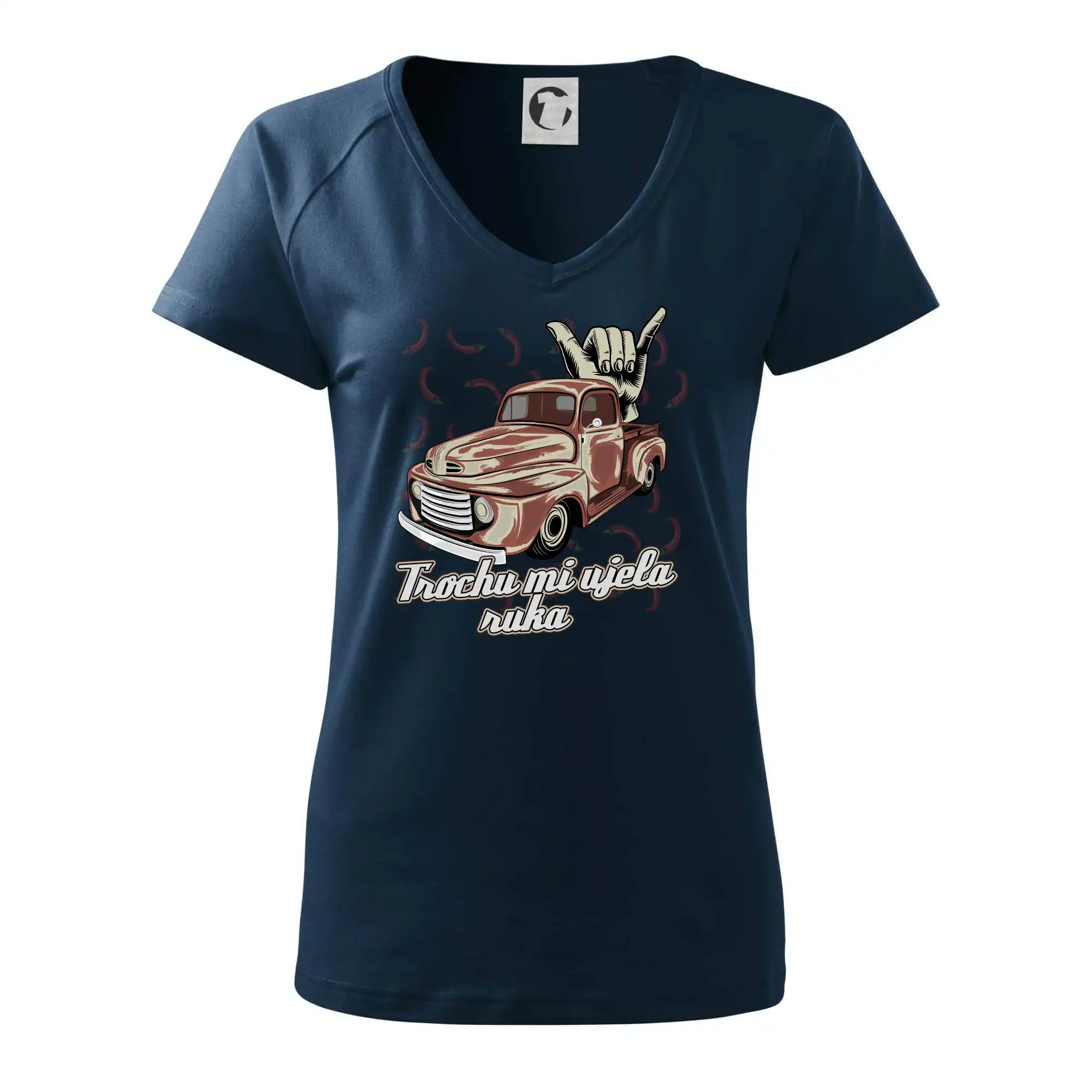 Vtipné tričko pre kuchára s nápisom "Trochu mi ušla ruka" s chilli papričkami. Pálivé papričky sa musia pridávať opatrne, niekedy sa to ale nepodarí a je ich v jedle toľko, že by to naštartovalo aj auto.
