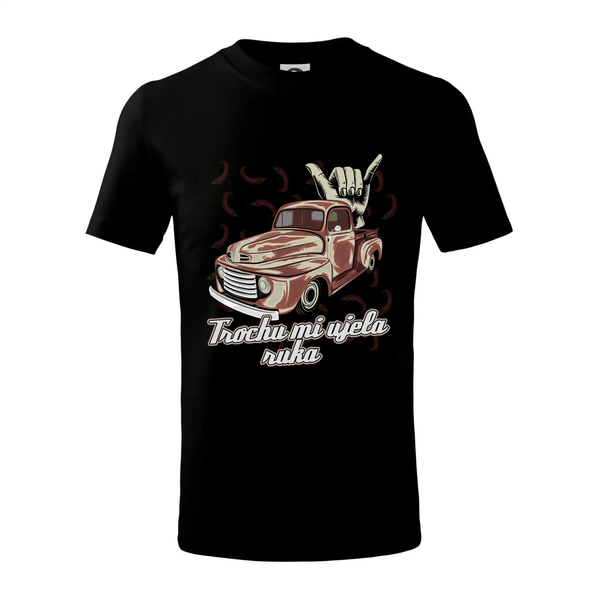 Vtipné tričko pre kuchára s nápisom "Trochu mi ušla ruka" s chilli papričkami. Pálivé papričky sa musia pridávať opatrne, niekedy sa to ale nepodarí a je ich v jedle toľko, že by to naštartovalo aj auto.