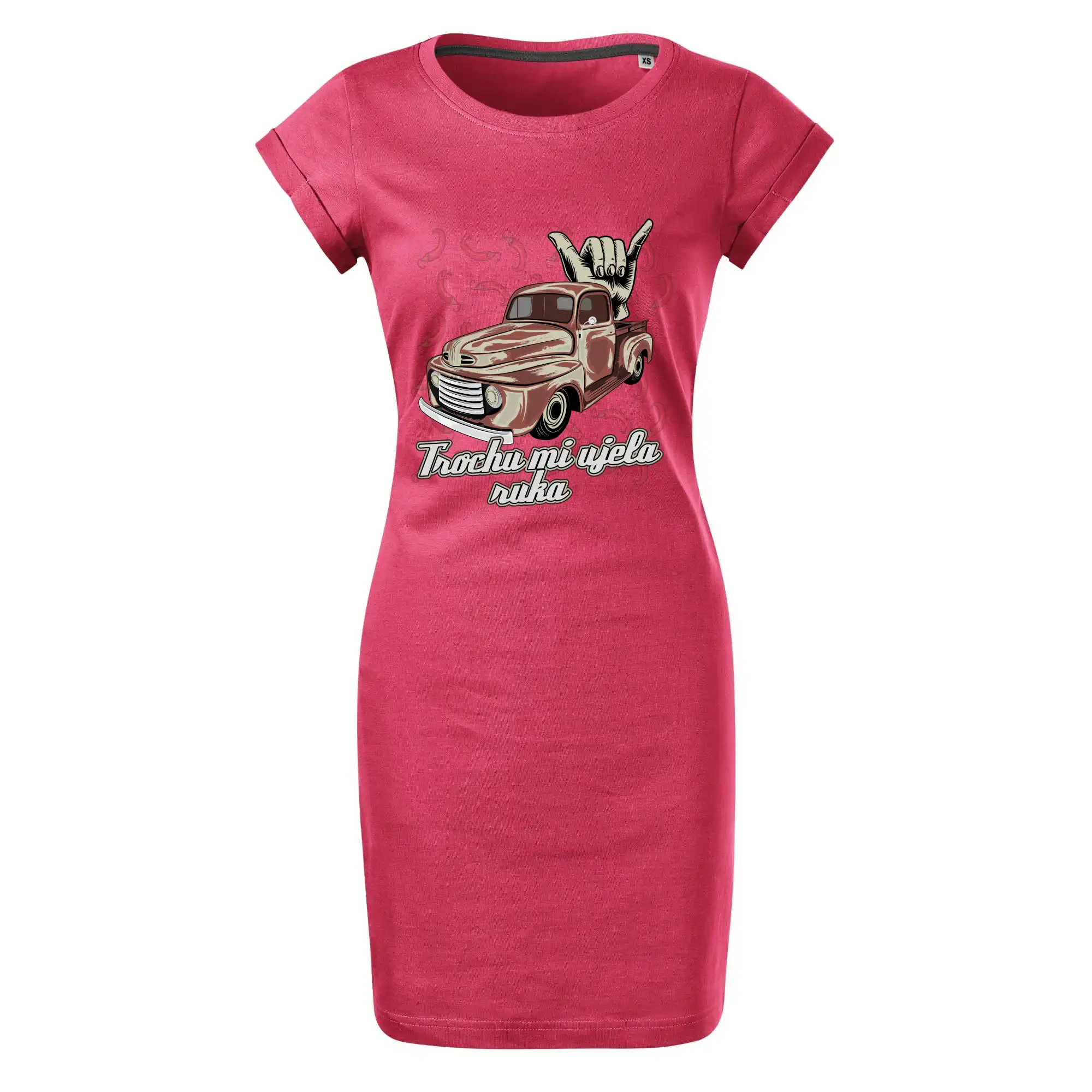 Vtipné tričko pre kuchára s nápisom "Trochu mi ušla ruka" s chilli papričkami. Pálivé papričky sa musia pridávať opatrne, niekedy sa to ale nepodarí a je ich v jedle toľko, že by to naštartovalo aj auto.