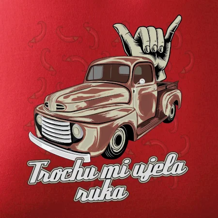 Vtipné tričko pre kuchára s nápisom "Trochu mi ušla ruka" s chilli papričkami. Pálivé papričky sa musia pridávať opatrne, niekedy sa to ale nepodarí a je ich v jedle toľko, že by to naštartovalo aj auto.