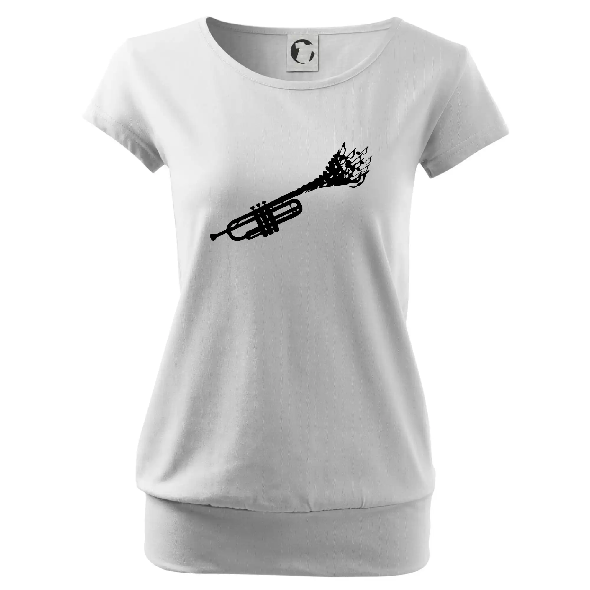 Trendové dámske tričko s veľmi krátkym rukávom, voľnejšieho strihu, v dolnom kraji všité do širokého lemu. Okrúhly priekrčník s úzkym lemom zo zhodného materiálu.