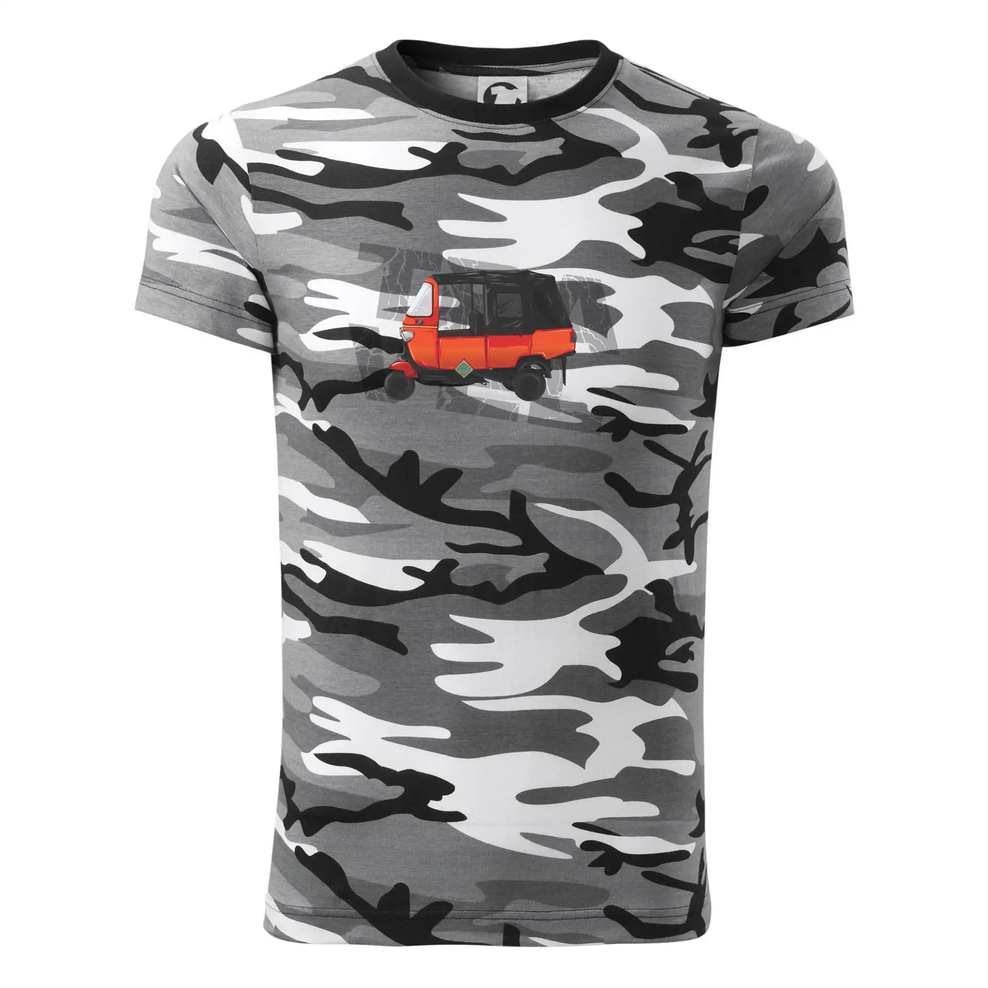 Tričko strednej gramáže vo farbách camouflage. Strih s bočnými švami. Lem priekrčníku z rebrového úpletu s prídavkom 5% elastanu. Vnútorná časť zadného priekrčníka začistená páskou vo farbe camouflage.