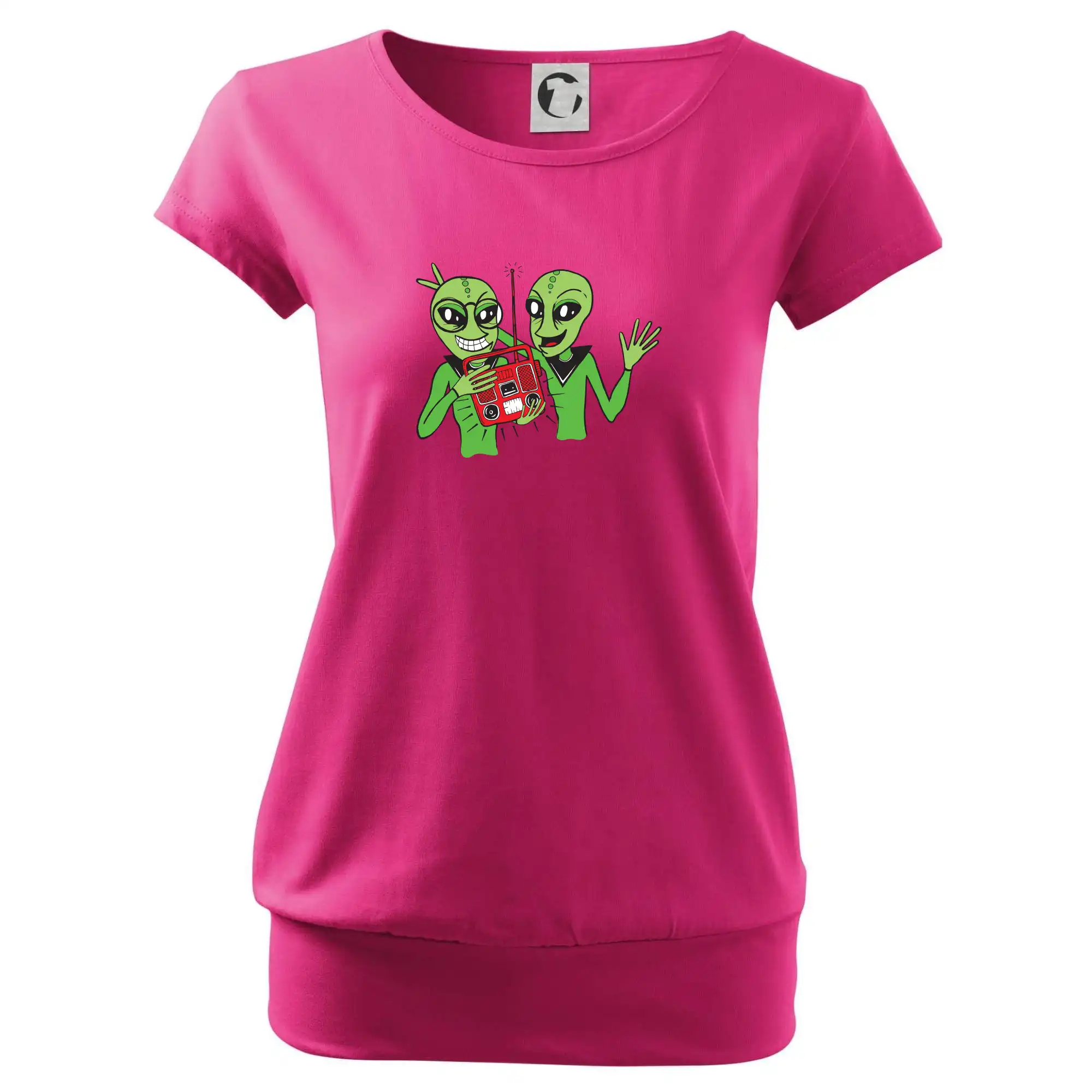 Trendové dámske tričko s veľmi krátkym rukávom, voľnejšieho strihu, v dolnom kraji všité do širokého lemu. Okrúhly priekrčník s úzkym lemom zo zhodného materiálu.