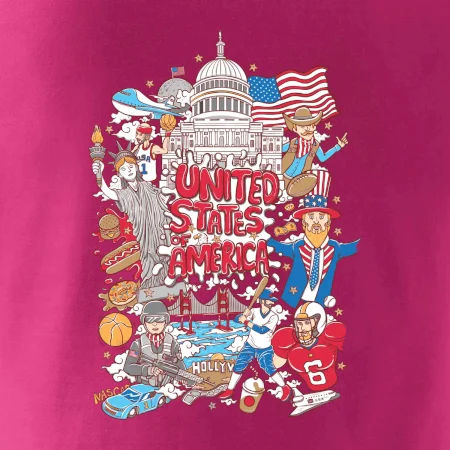 Cestovateľské tričko pre cestovateľa, ktorý má rád USA. Tričko s motívom "United states of America" Ti pozvanie do Ameriky uľahčí. Tričko je vhodné pre cestovateľov, ktorí majú radi poznávanie nových zemí, najmä Spojených štátov amerických. Amerika s týmto tričko bude na dosah.