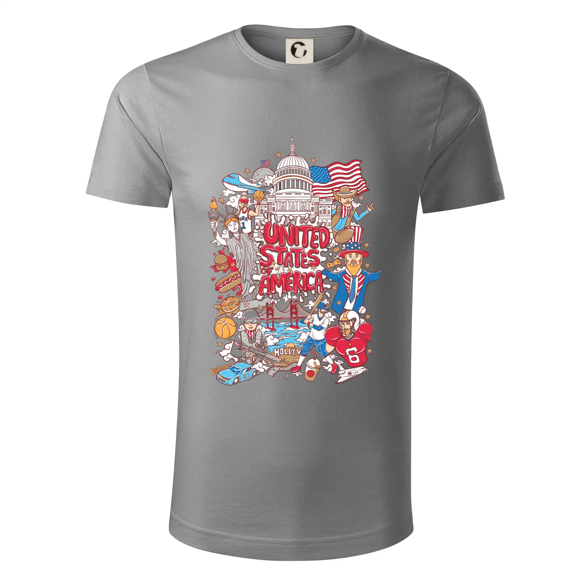 Cestovateľské tričko pre cestovateľa, ktorý má rád USA. Tričko s motívom "United states of America" Ti pozvanie do Ameriky uľahčí. Tričko je vhodné pre cestovateľov, ktorí majú radi poznávanie nových zemí, najmä Spojených štátov amerických. Amerika s týmto tričko bude na dosah.
