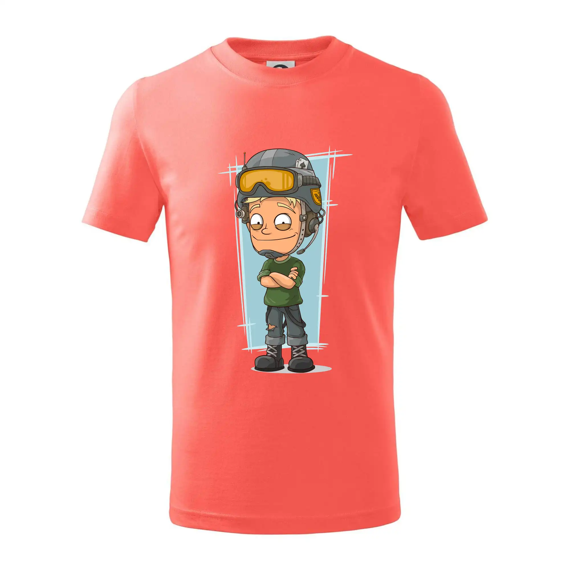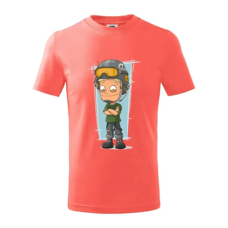 Detské tričko strednej gramáže s bočnými švami. Úzky priekrčník s prídavkom 5% elastanu. Vnútorná časť zadného priekrčníka začistená tkanou páskou. Spevnený ramenný šev.