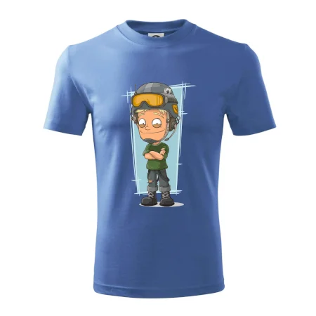 Detské tričko strednej gramáže s bočnými švami. Úzky priekrčník s prídavkom 5% elastanu. Vnútorná časť zadného priekrčníka začistená tkanou páskou. Spevnený ramenný šev.