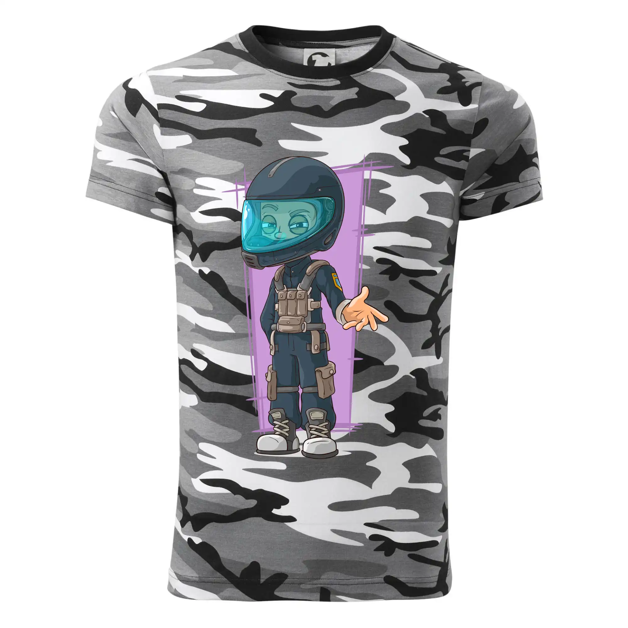 Tričko strednej gramáže vo farbách camouflage. Strih s bočnými švami. Lem priekrčníku z rebrového úpletu s prídavkom 5% elastanu. Vnútorná časť zadného priekrčníka začistená páskou vo farbe camouflage.