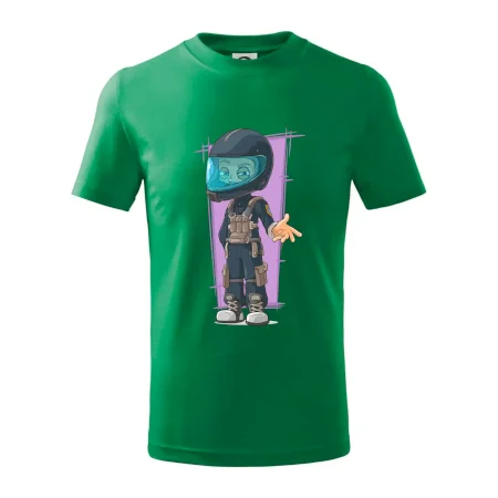 Detské tričko strednej gramáže s bočnými švami. Úzky priekrčník s prídavkom 5% elastanu. Vnútorná časť zadného priekrčníka začistená tkanou páskou. Spevnený ramenný šev.