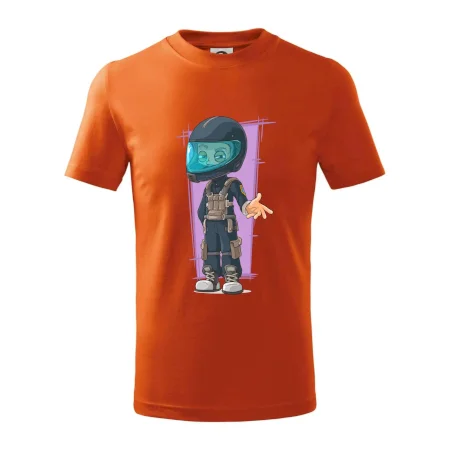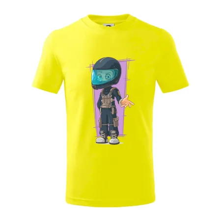 Detské tričko strednej gramáže s bočnými švami. Úzky priekrčník s prídavkom 5% elastanu. Vnútorná časť zadného priekrčníka začistená tkanou páskou. Spevnený ramenný šev.