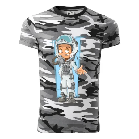 Tričko strednej gramáže vo farbách camouflage. Strih s bočnými švami. Lem priekrčníku z rebrového úpletu s prídavkom 5% elastanu. Vnútorná časť zadného priekrčníka začistená páskou vo farbe camouflage.