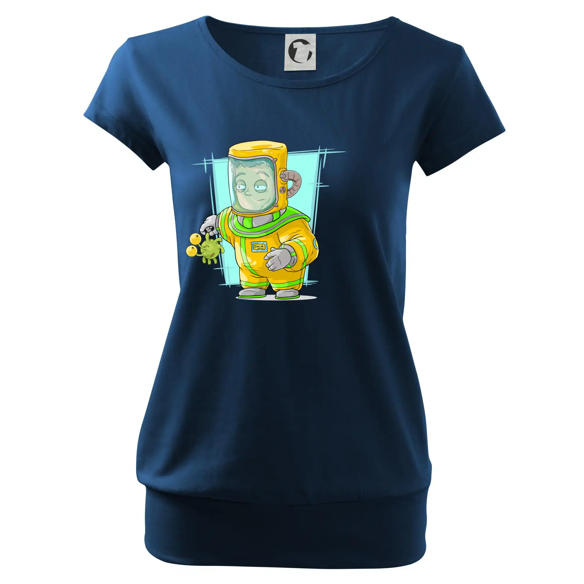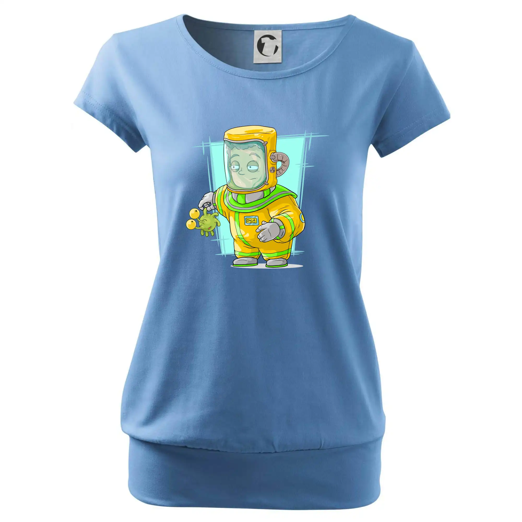 Trendové dámske tričko s veľmi krátkym rukávom, voľnejšieho strihu, v dolnom kraji všité do širokého lemu. Okrúhly priekrčník s úzkym lemom zo zhodného materiálu.