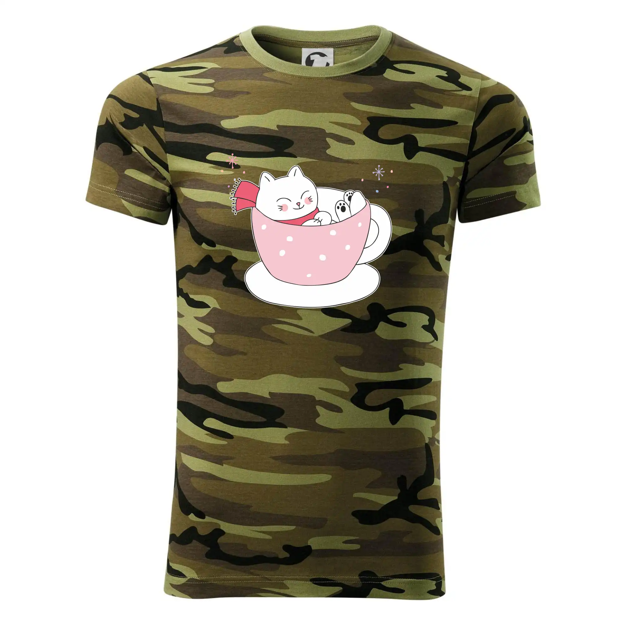 Tričko strednej gramáže vo farbách camouflage. Strih s bočnými švami. Lem priekrčníku z rebrového úpletu s prídavkom 5% elastanu. Vnútorná časť zadného priekrčníka začistená páskou vo farbe camouflage.