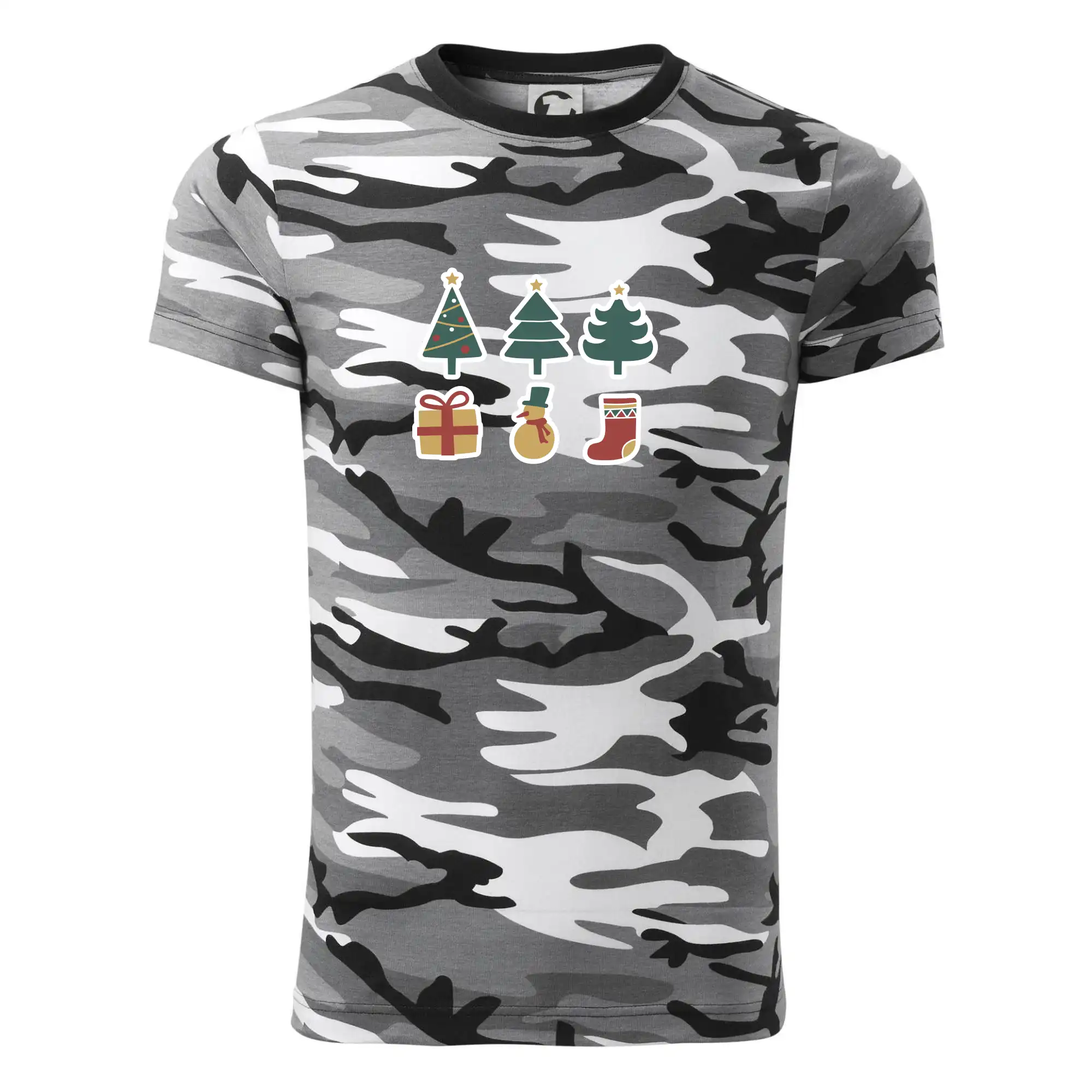 Tričko strednej gramáže vo farbách camouflage. Strih s bočnými švami. Lem priekrčníku z rebrového úpletu s prídavkom 5% elastanu. Vnútorná časť zadného priekrčníka začistená páskou vo farbe camouflage.