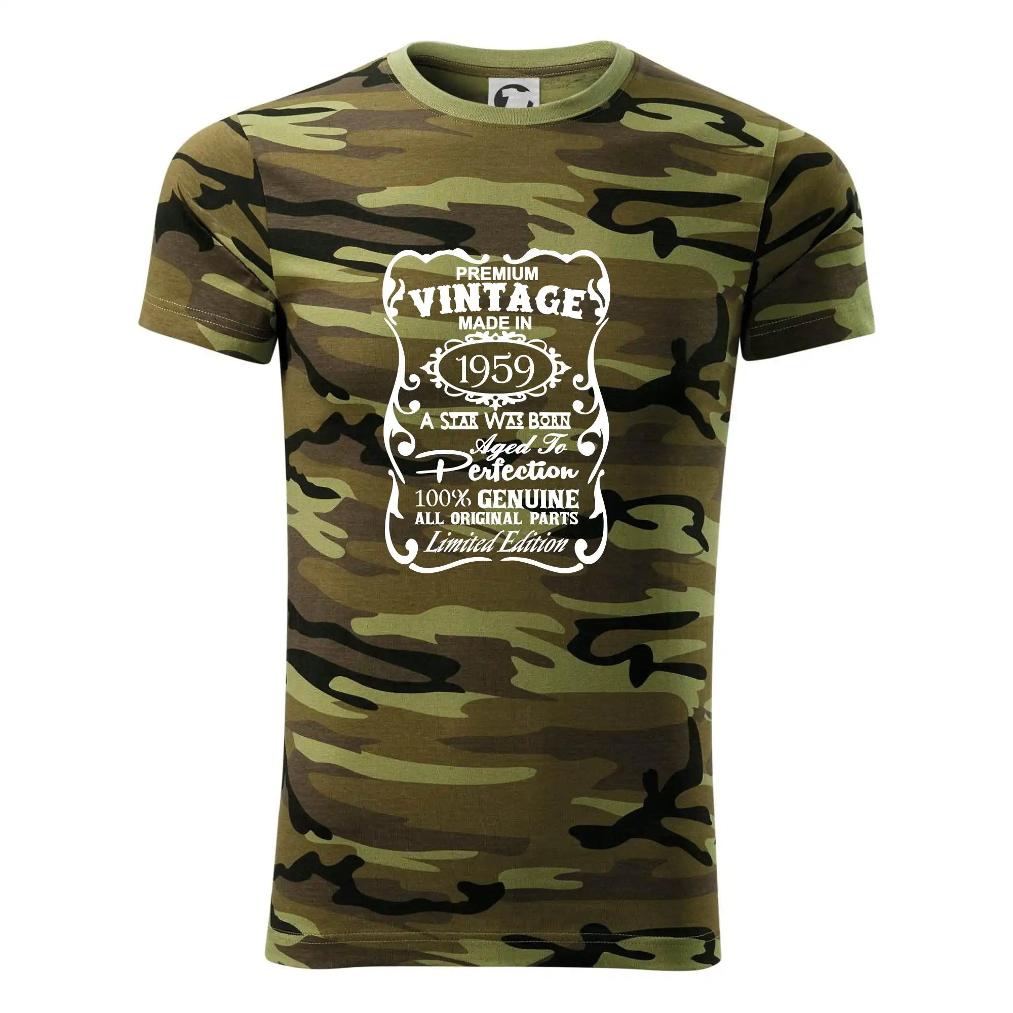 Tričko strednej gramáže vo farbách camouflage. Strih s bočnými švami. Lem priekrčníku z rebrového úpletu s prídavkom 5% elastanu. Vnútorná časť zadného priekrčníka začistená páskou vo farbe camouflage.