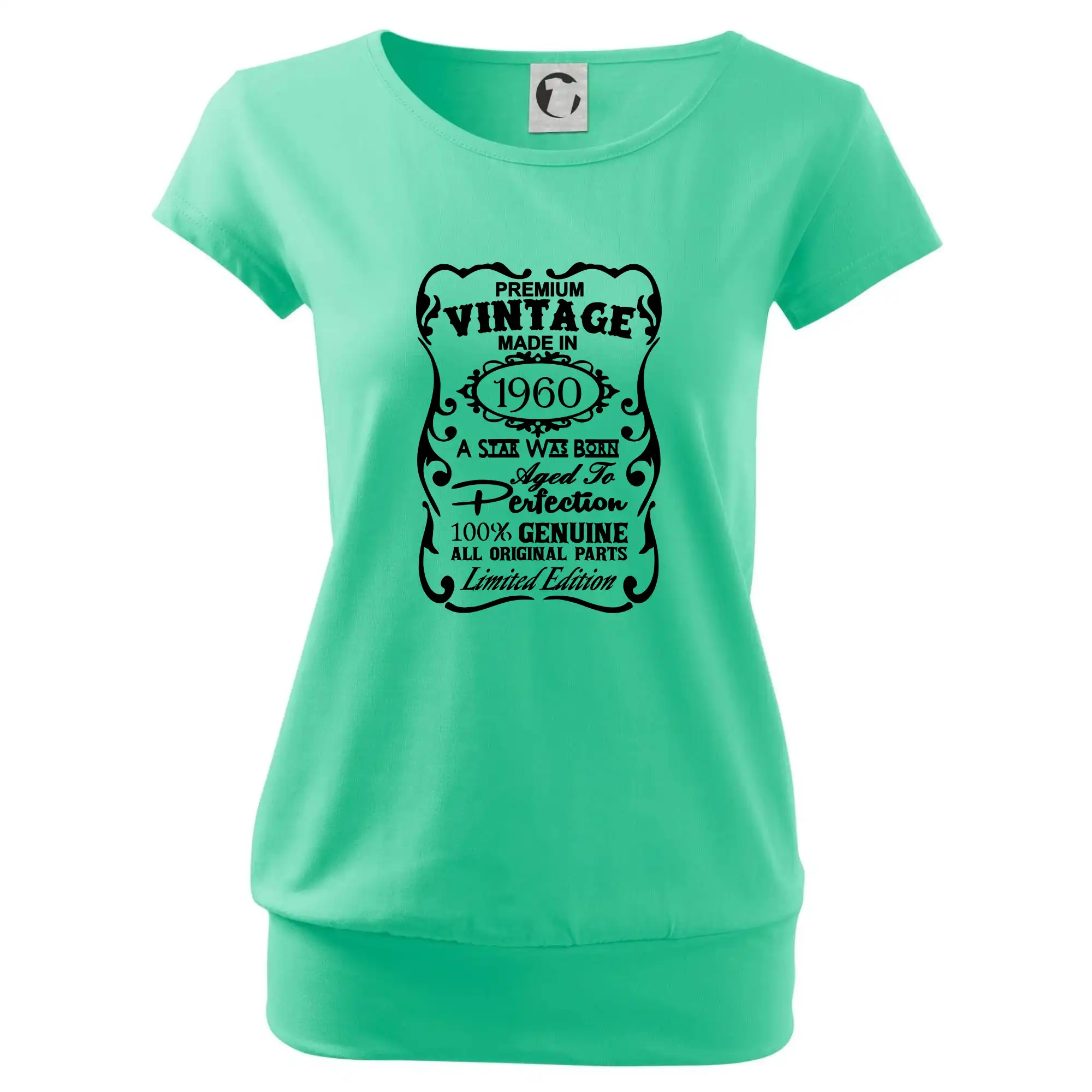 Trendové dámske tričko s veľmi krátkym rukávom, voľnejšieho strihu, v dolnom kraji všité do širokého lemu. Okrúhly priekrčník s úzkym lemom zo zhodného materiálu.