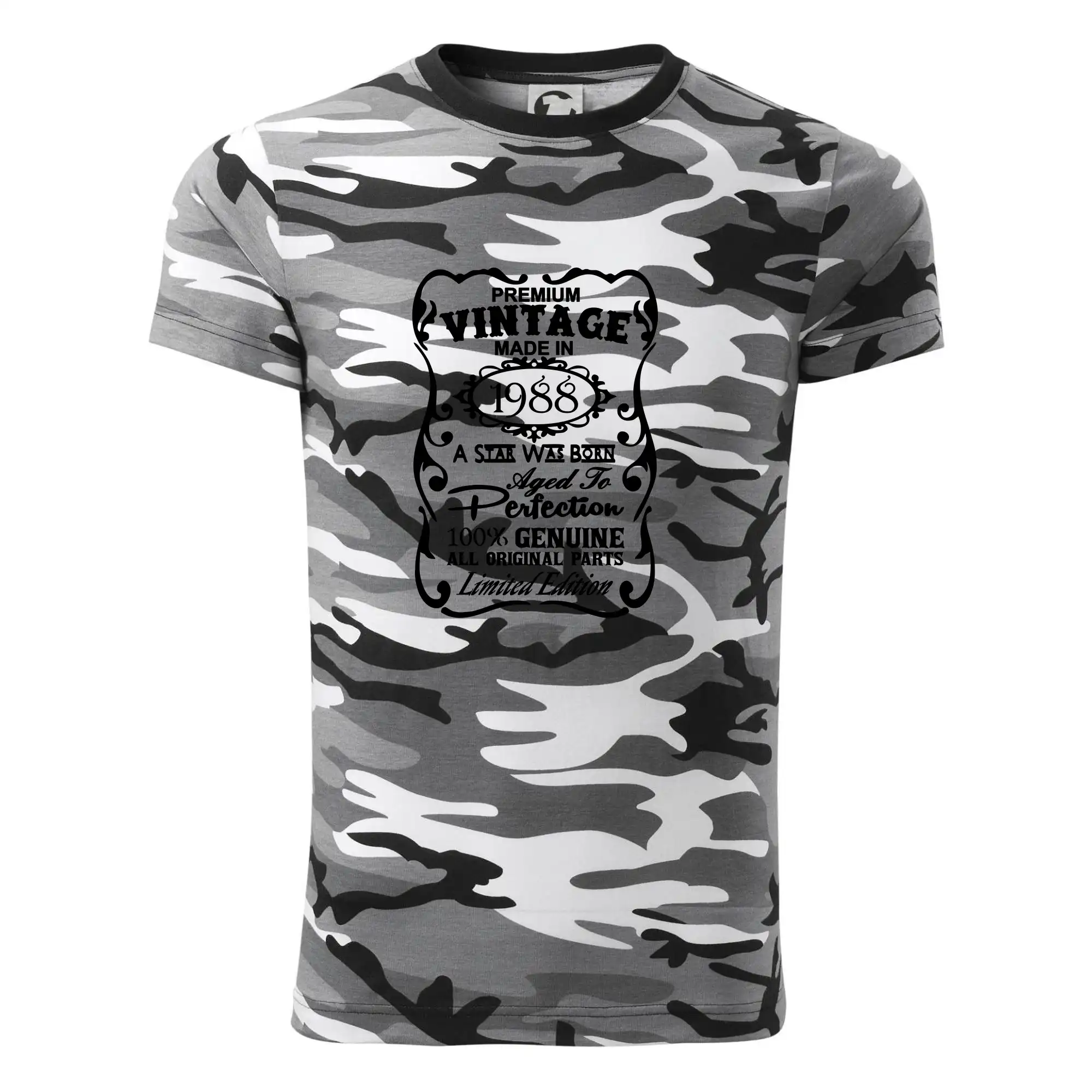 Tričko strednej gramáže vo farbách camouflage. Strih s bočnými švami. Lem priekrčníku z rebrového úpletu s prídavkom 5% elastanu. Vnútorná časť zadného priekrčníka začistená páskou vo farbe camouflage.