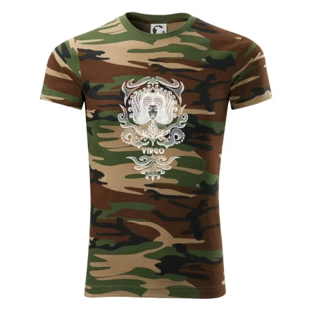 Tričko strednej gramáže vo farbách camouflage. Strih s bočnými švami. Lem priekrčníku z rebrového úpletu s prídavkom 5% elastanu. Vnútorná časť zadného priekrčníka začistená páskou vo farbe camouflage.