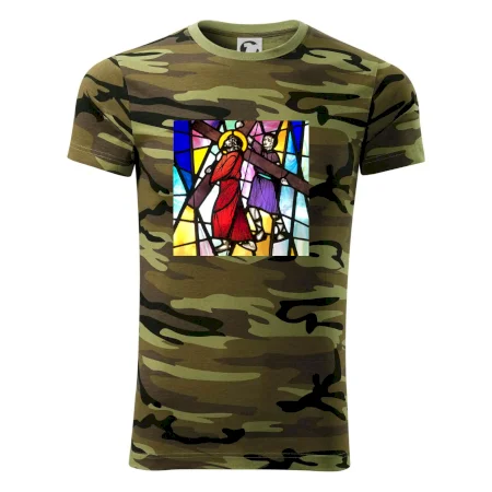 Tričko strednej gramáže vo farbách camouflage. Strih s bočnými švami. Lem priekrčníku z rebrového úpletu s prídavkom 5% elastanu. Vnútorná časť zadného priekrčníka začistená páskou vo farbe camouflage.