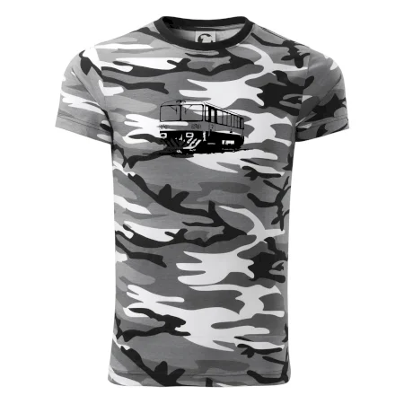 Tričko strednej gramáže vo farbách camouflage. Strih s bočnými švami. Lem priekrčníku z rebrového úpletu s prídavkom 5% elastanu. Vnútorná časť zadného priekrčníka začistená páskou vo farbe camouflage.