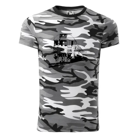 Tričko strednej gramáže vo farbách camouflage. Strih s bočnými švami. Lem priekrčníku z rebrového úpletu s prídavkom 5% elastanu. Vnútorná časť zadného priekrčníka začistená páskou vo farbe camouflage.