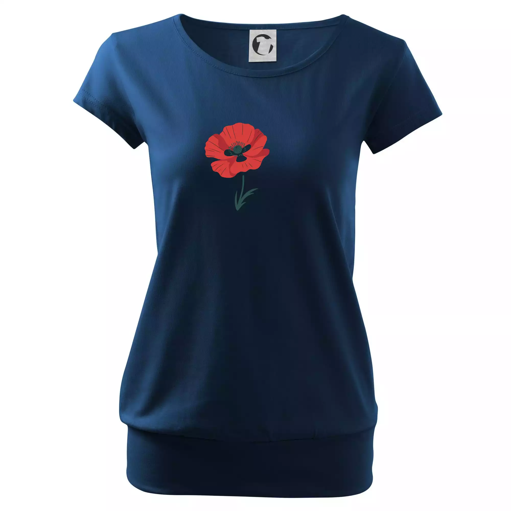 Trendové dámske tričko s veľmi krátkym rukávom, voľnejšieho strihu, v dolnom kraji všité do širokého lemu. Okrúhly priekrčník s úzkym lemom zo zhodného materiálu.