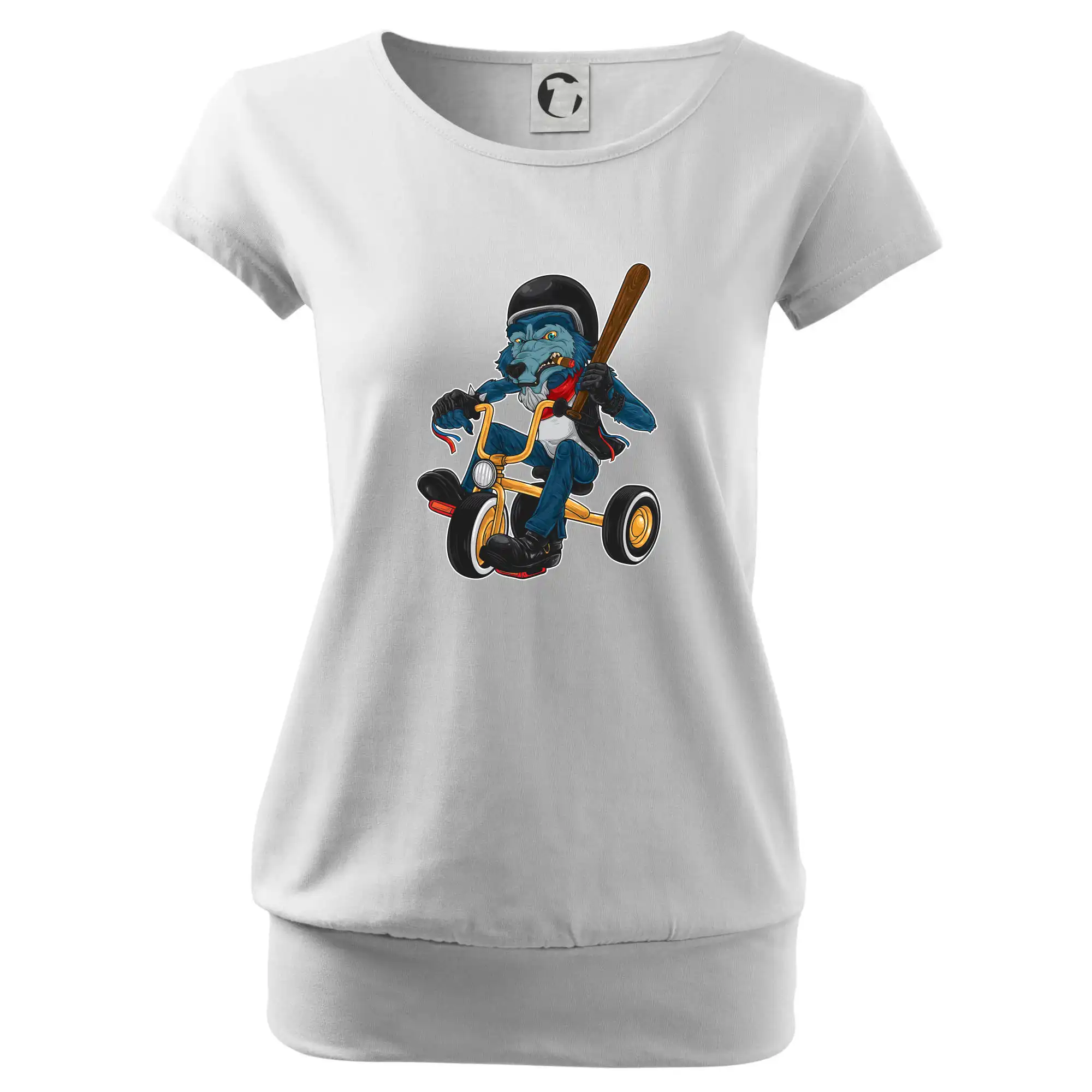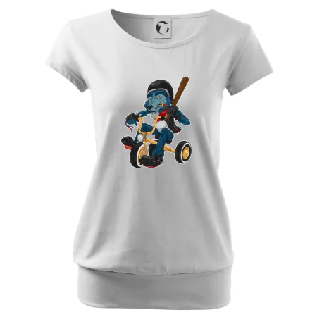 Trendové dámske tričko s veľmi krátkym rukávom, voľnejšieho strihu, v dolnom kraji všité do širokého lemu. Okrúhly priekrčník s úzkym lemom zo zhodného materiálu.