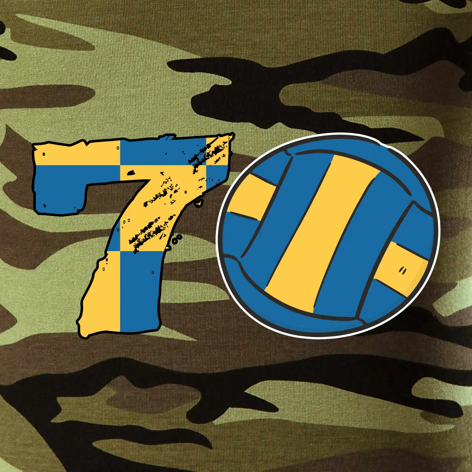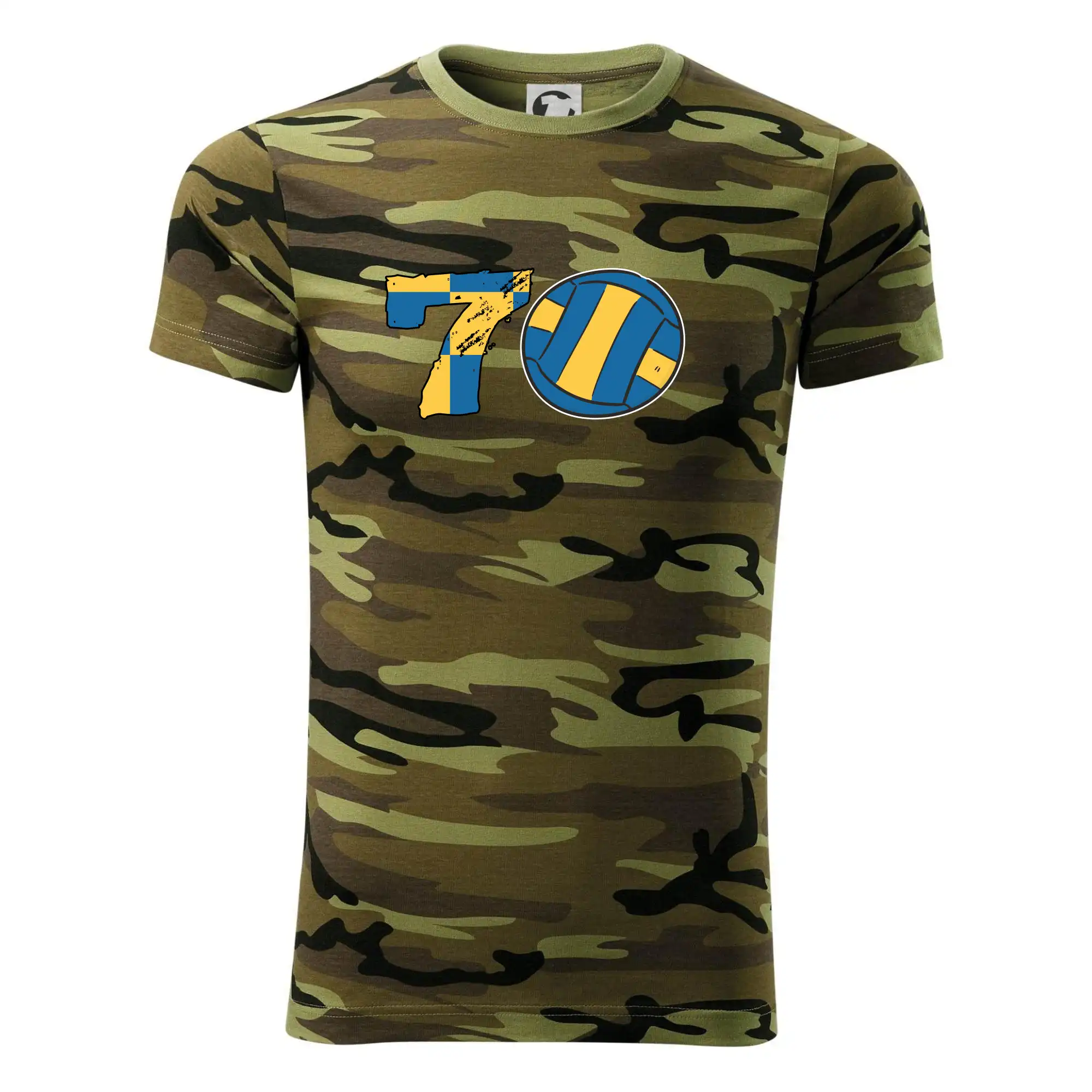 Tričko strednej gramáže vo farbách camouflage. Strih s bočnými švami. Lem priekrčníku z rebrového úpletu s prídavkom 5% elastanu. Vnútorná časť zadného priekrčníka začistená páskou vo farbe camouflage.