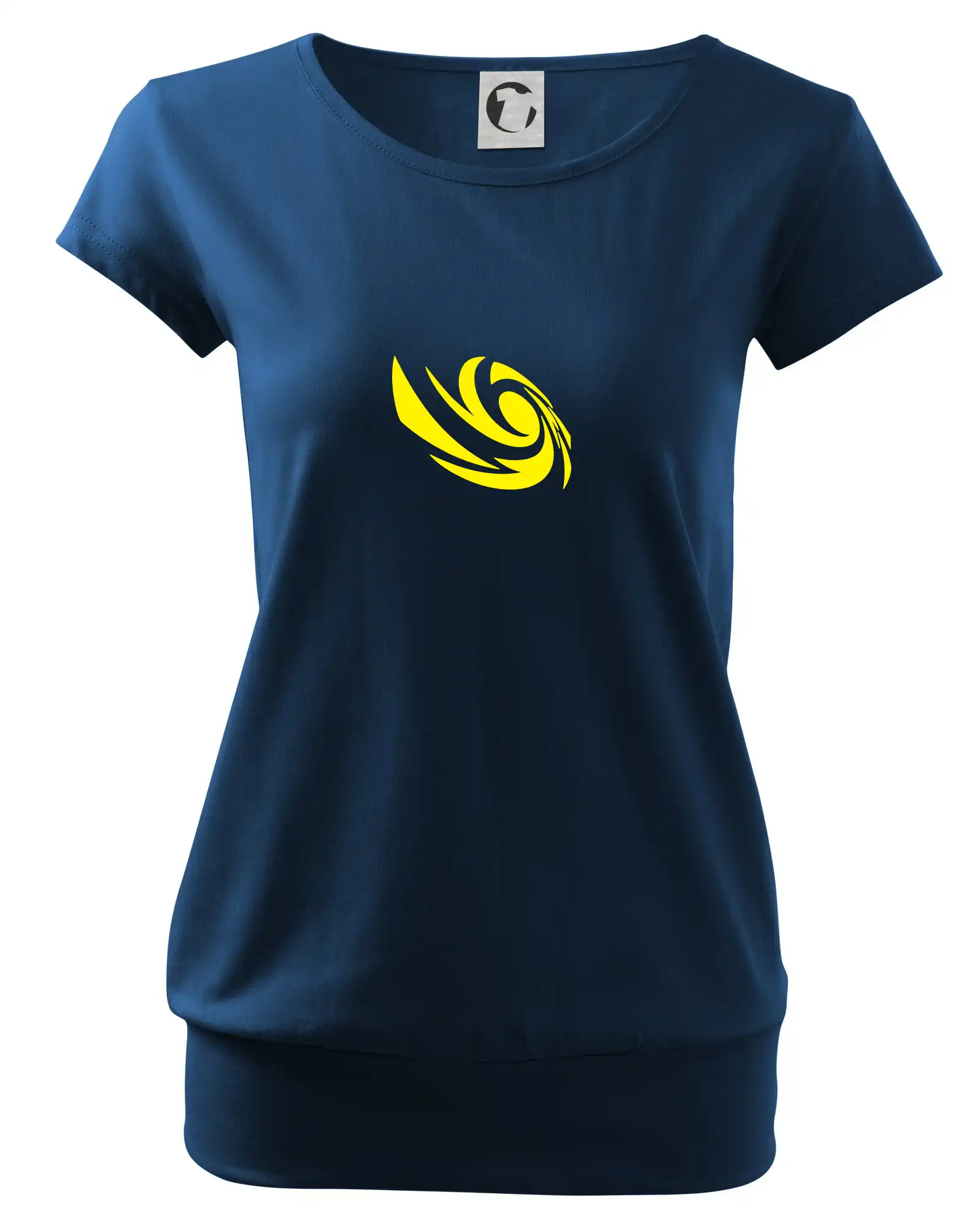 Trendové dámske tričko s veľmi krátkym rukávom, voľnejšieho strihu, v dolnom kraji všité do širokého lemu. Okrúhly priekrčník s úzkym lemom zo zhodného materiálu.
