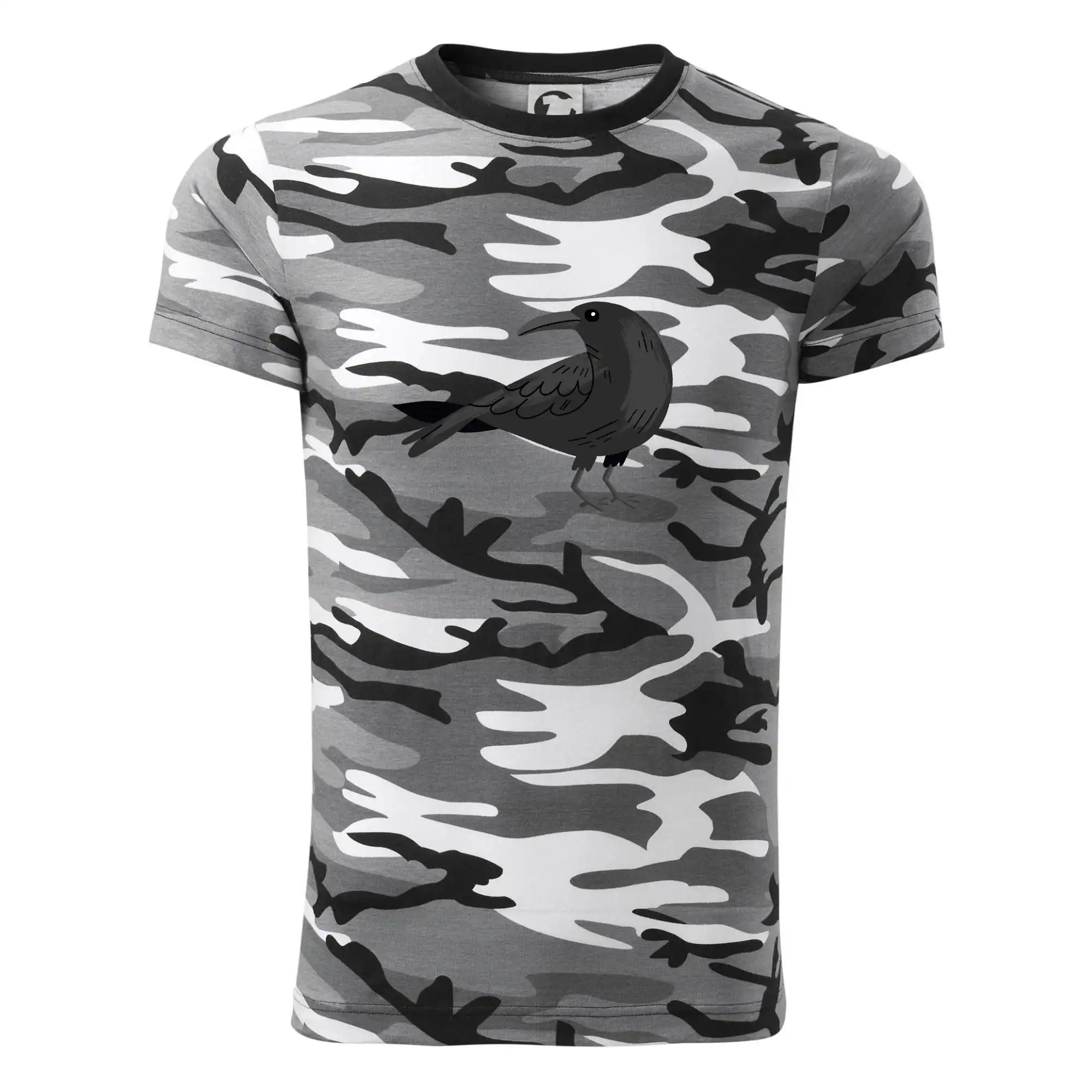 Tričko strednej gramáže vo farbách camouflage. Strih s bočnými švami. Lem priekrčníku z rebrového úpletu s prídavkom 5% elastanu. Vnútorná časť zadného priekrčníka začistená páskou vo farbe camouflage.