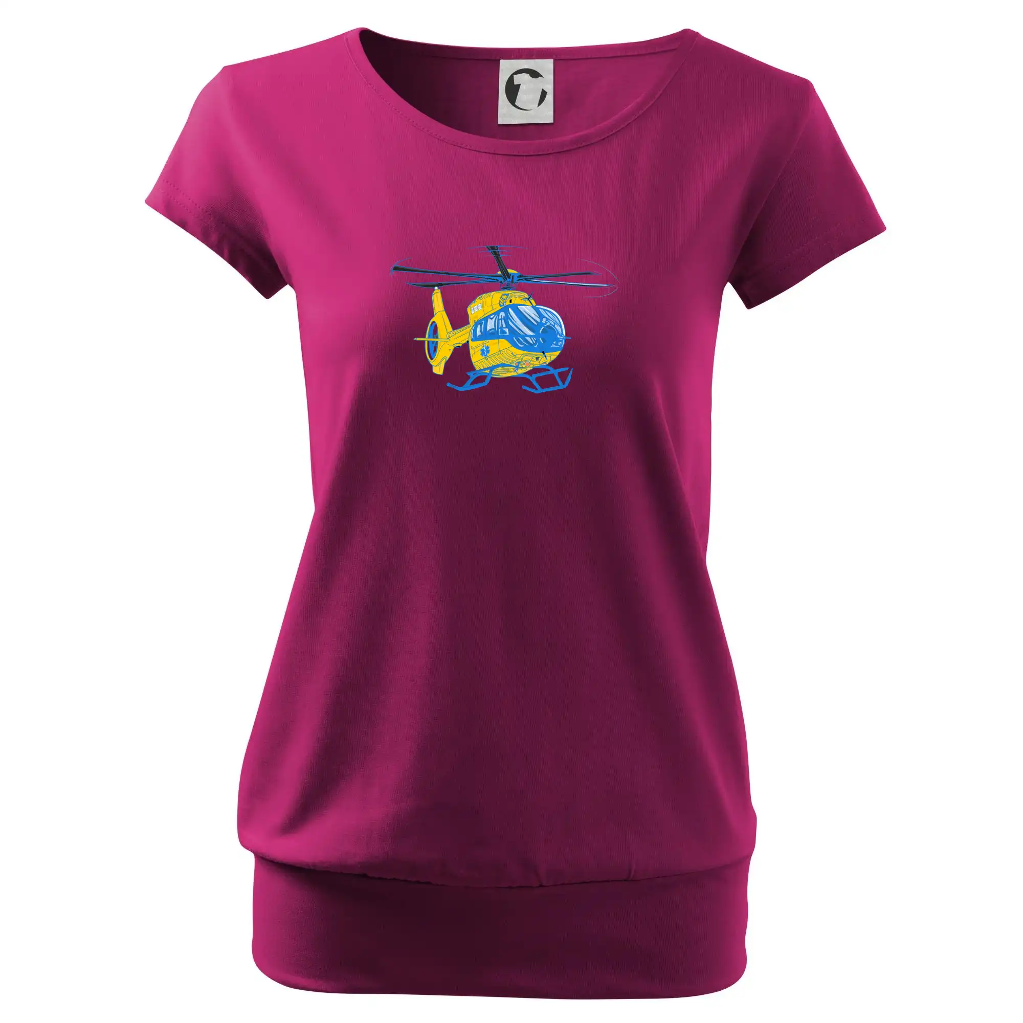 Trendové dámske tričko s veľmi krátkym rukávom, voľnejšieho strihu, v dolnom kraji všité do širokého lemu. Okrúhly priekrčník s úzkym lemom zo zhodného materiálu.