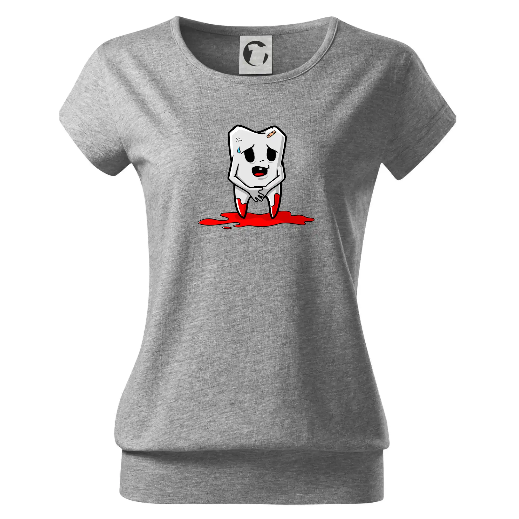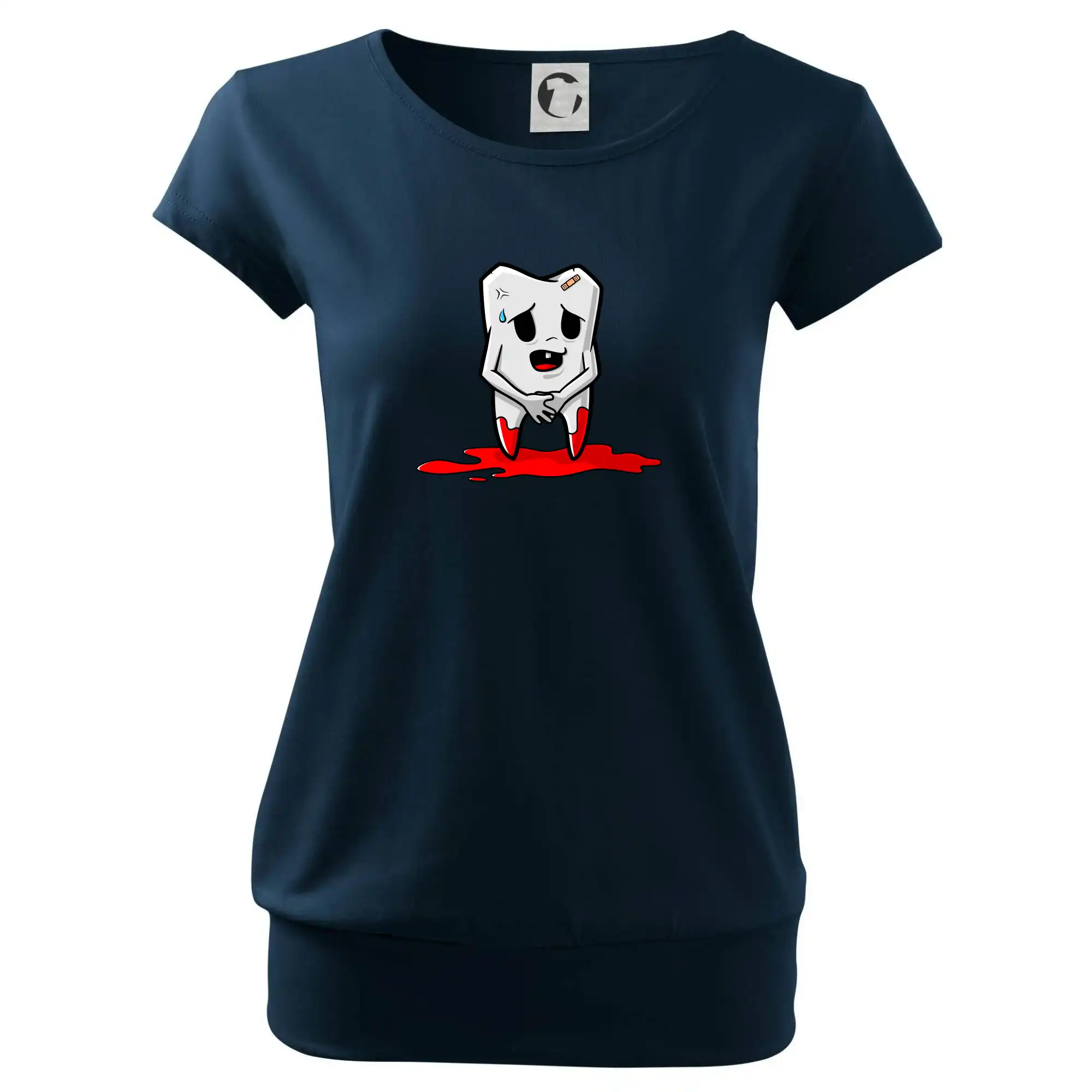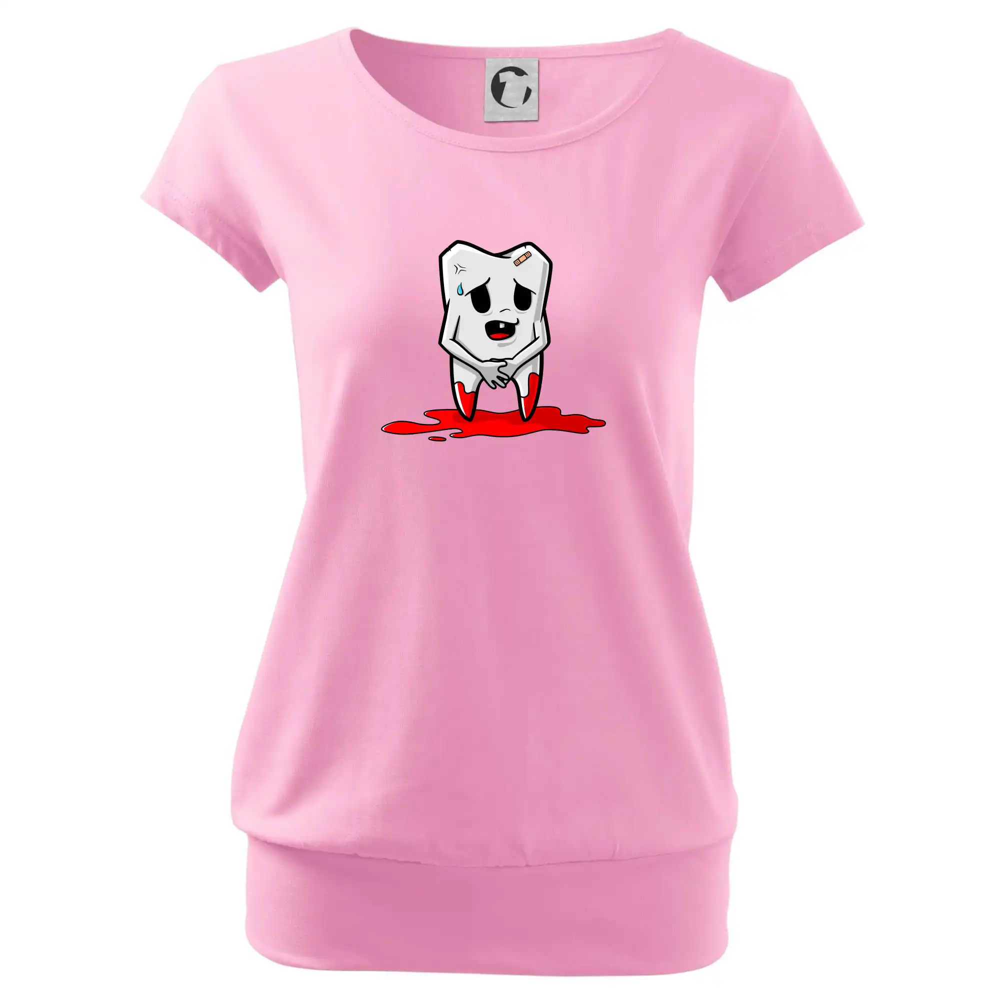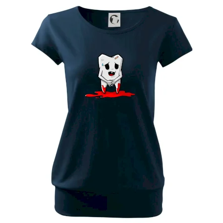 Trendové dámske tričko s veľmi krátkym rukávom, voľnejšieho strihu, v dolnom kraji všité do širokého lemu. Okrúhly priekrčník s úzkym lemom zo zhodného materiálu.