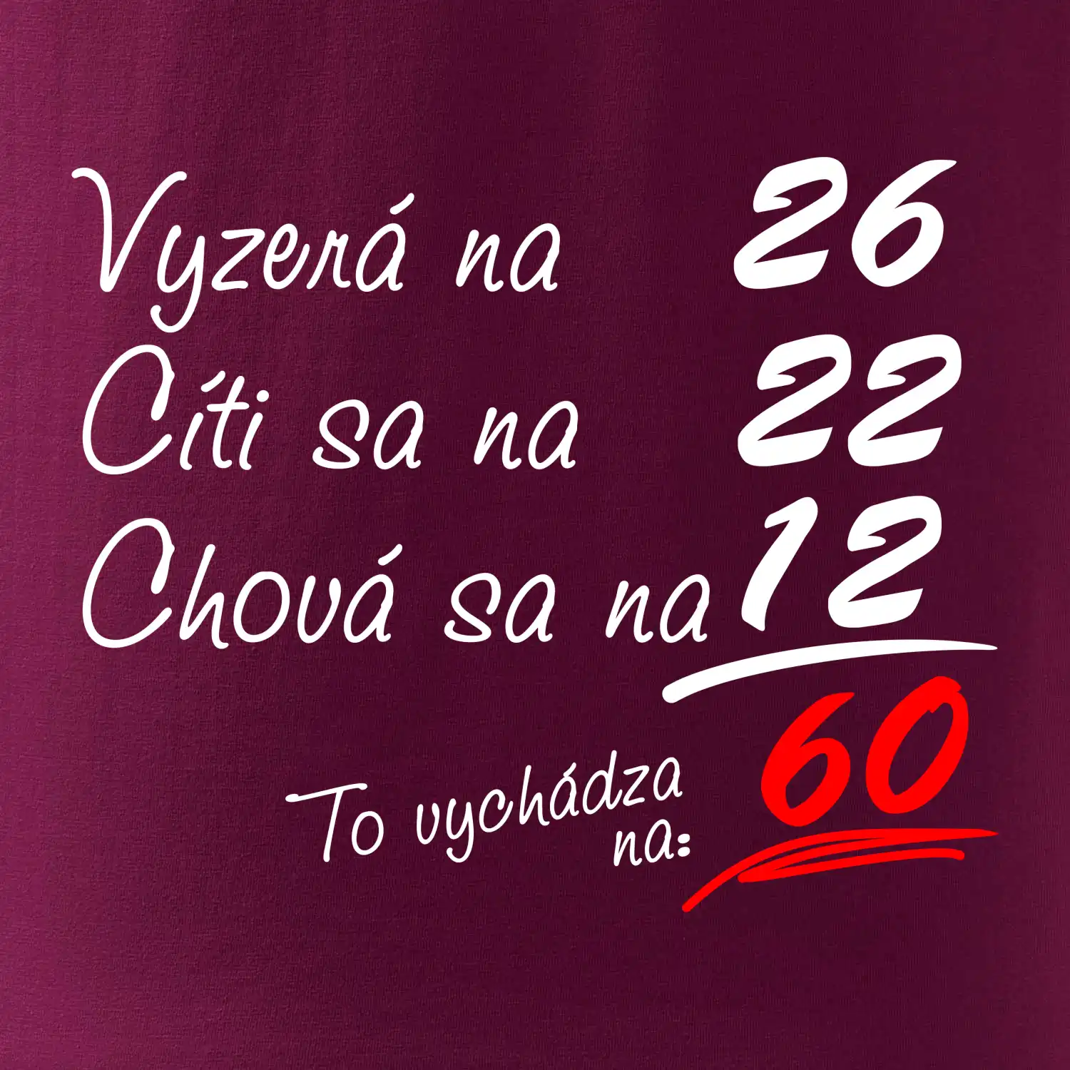 Tričko na narodeniny pre všetkých, ktorí sa cítia na menej než v skutočnosti majú. Pre všetkých, ktorí majú zmysel pre humor a majú radi vtipné darčeky.