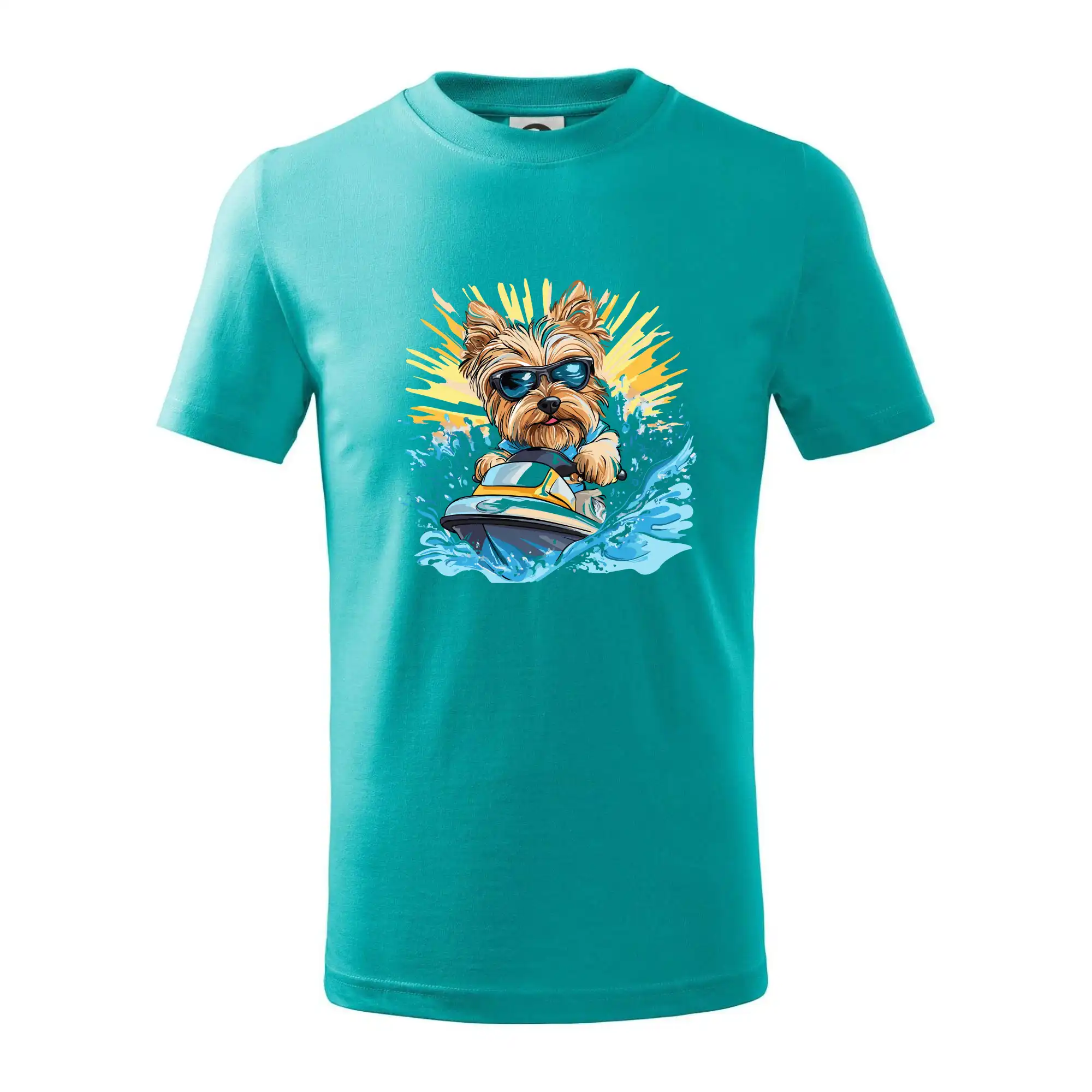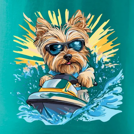Yorkšírsky teriér na vodnom skútri
