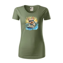Dámske tričko s ľahko priliehavým strihom, ktorý pôsobí elegantne a skvele padne. Tento typ trička má kratšie rukávy a hlbší výstrih zakončený jemným lemovaním.