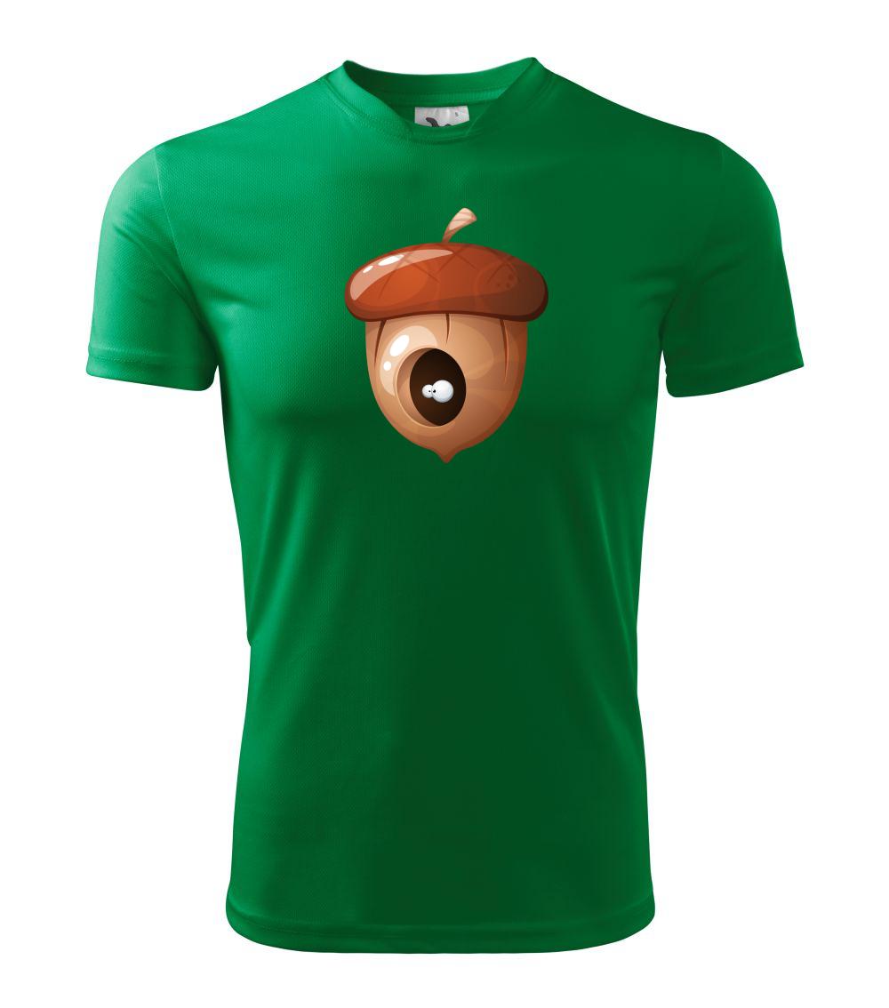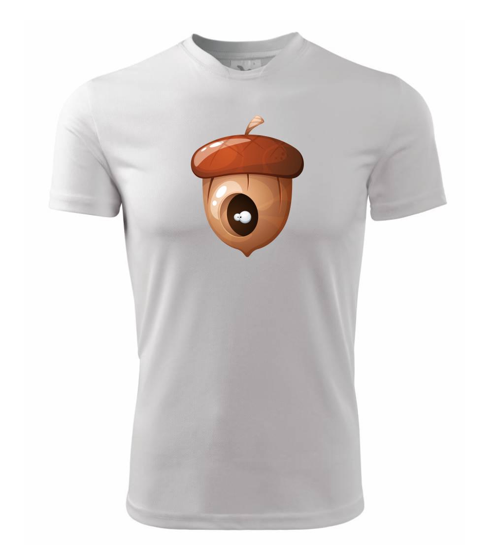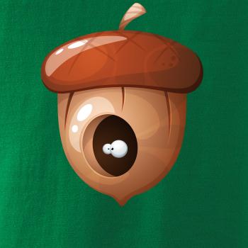 Tričko pre dieťa, na ktorom je žaluď, z ktorého pozerajú oči.V žaludi má brloh veverička alebo iné zviera. Celý orech nezjedla, len si v ňom urobil úkryt.