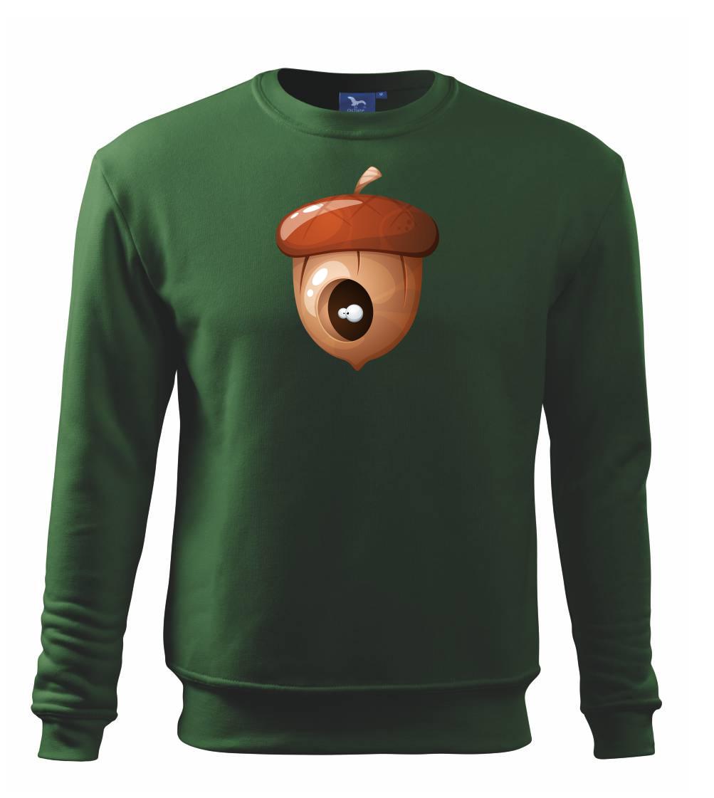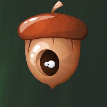 Tričko pre dieťa, na ktorom je žaluď, z ktorého pozerajú oči.V žaludi má brloh veverička alebo iné zviera. Celý orech nezjedla, len si v ňom urobil úkryt.