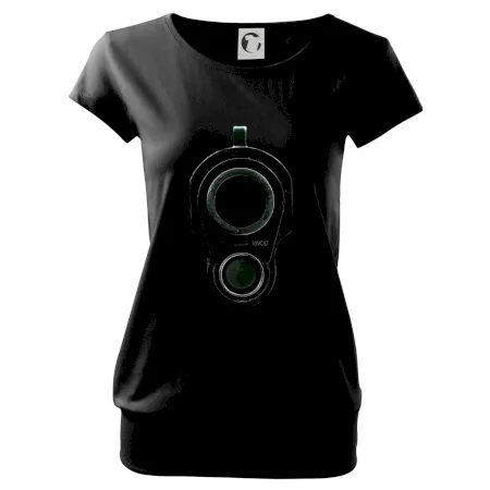 Trendové dámske tričko s veľmi krátkym rukávom, voľnejšieho strihu, v dolnom kraji všité do širokého lemu. Okrúhly priekrčník s úzkym lemom zo zhodného materiálu.