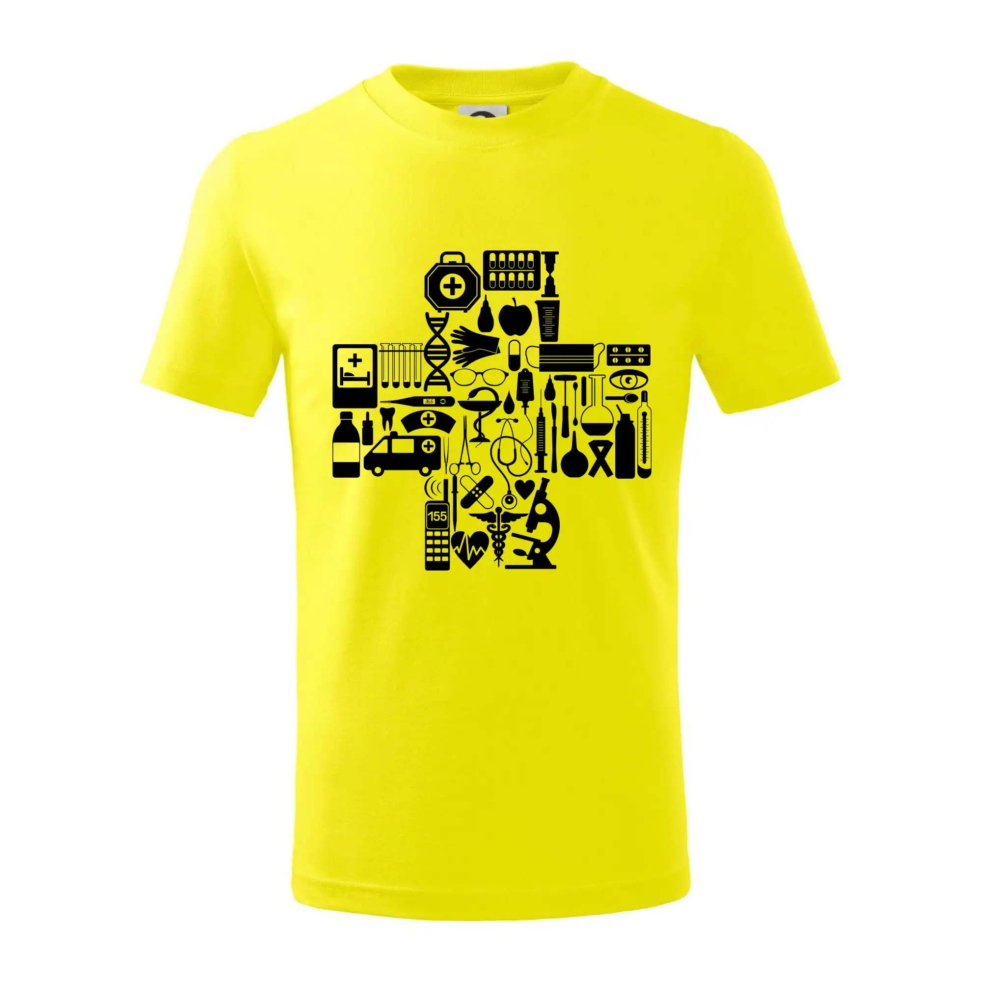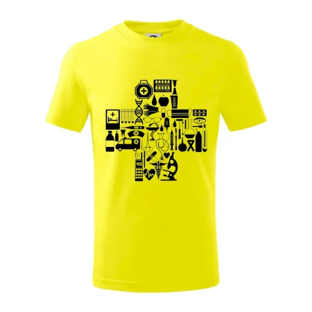 Detské tričko strednej gramáže s bočnými švami. Úzky priekrčník s prídavkom 5% elastanu. Vnútorná časť zadného priekrčníka začistená tkanou páskou. Spevnený ramenný šev.